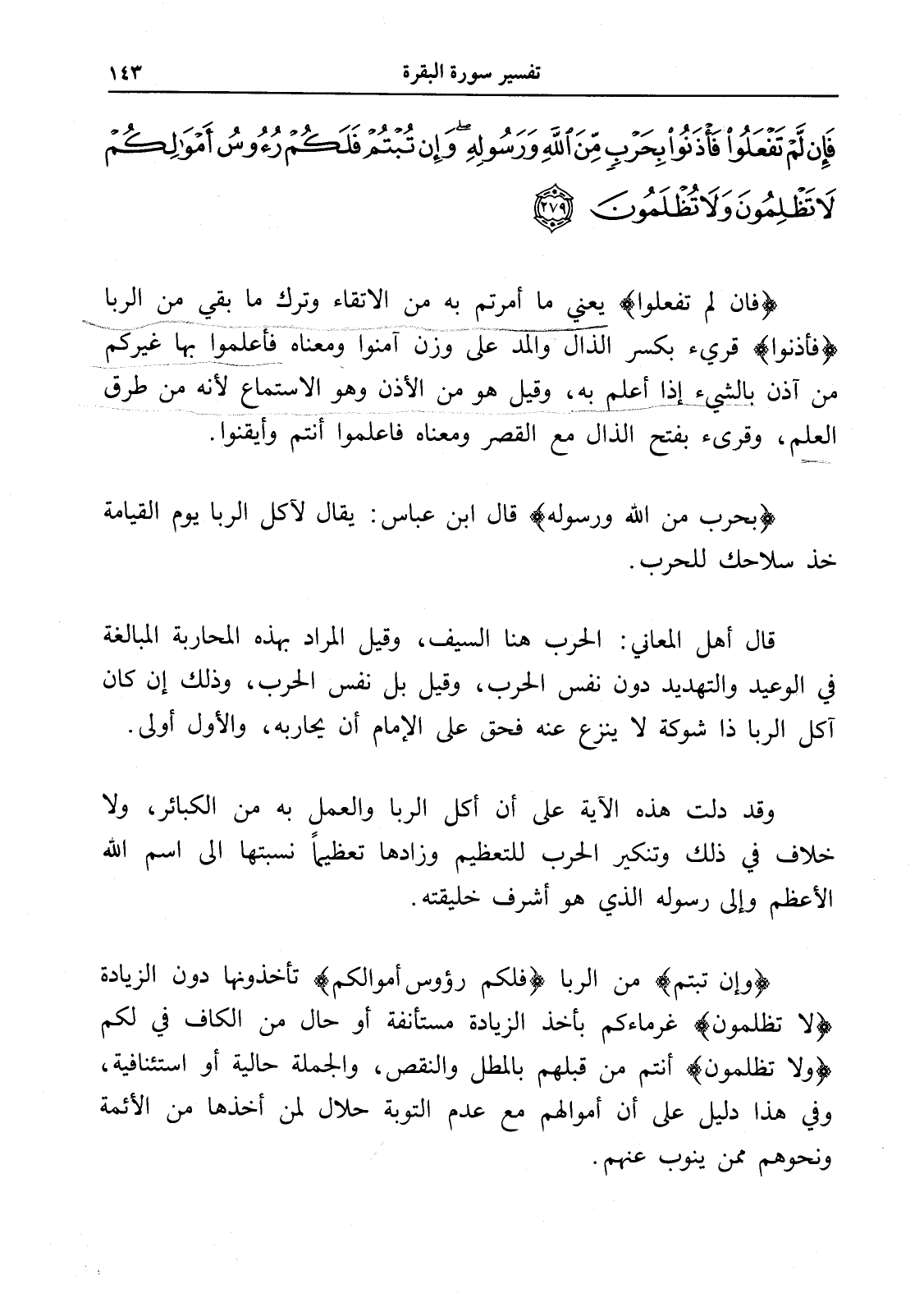 فَإِنْ لَمْ تَفْعَلُوا فَأْذَنُوا بِحَرْبٍ مِنَ اللَّهِ وَرَسُولِهِ وَإِنْ تُبْتُمْ فَلَكُمْ رُءُوسُ أَمْوَالِكُمْ لَا تَظْلِمُونَ وَلَا تُظْلَمُونَ (279)