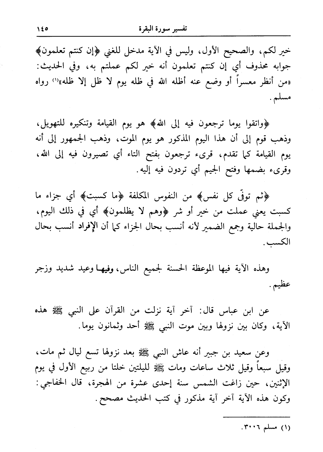 عن ابن عباس قال: آخر آية نزلت من القرآن على النبي - صلى الله عليه وسلم - هذه الآية، وكان بين نزولها وبين موت النبي - صلى الله عليه وسلم - أحد وثمانون يوماً.