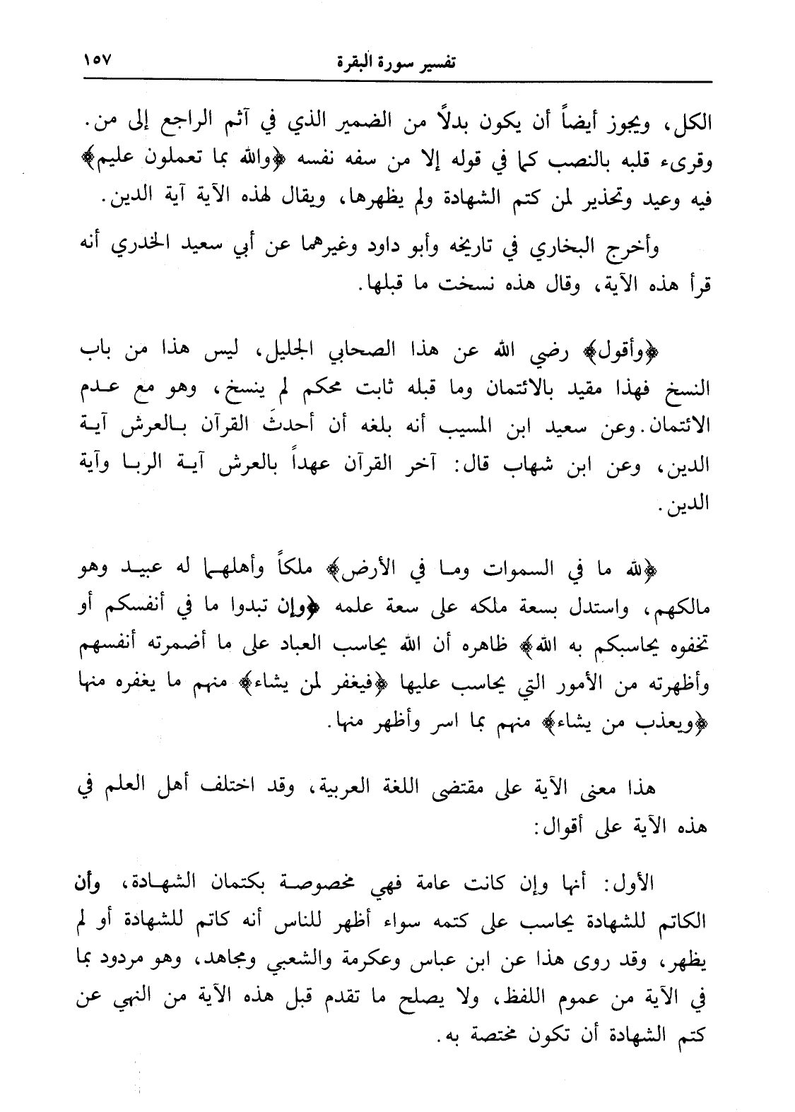 الأول: أنها وإن كانت عامة فهي مخصوصة بكتمان الشهادة، وأن الكاتم للشهادة يحاسب على كتمه سواء أظهر للناس أنه كاتم للشهادة أو لم يظهر، وقد روى هذا عن ابن عباس وعكرمة والشعبي ومجاهد، وهو مردود بما في الآية من عموم اللفظ، ولا يصلح ما تقدم قبل هذه الآية من النهي عن كتم الشهادة أن تكون مختصة به.