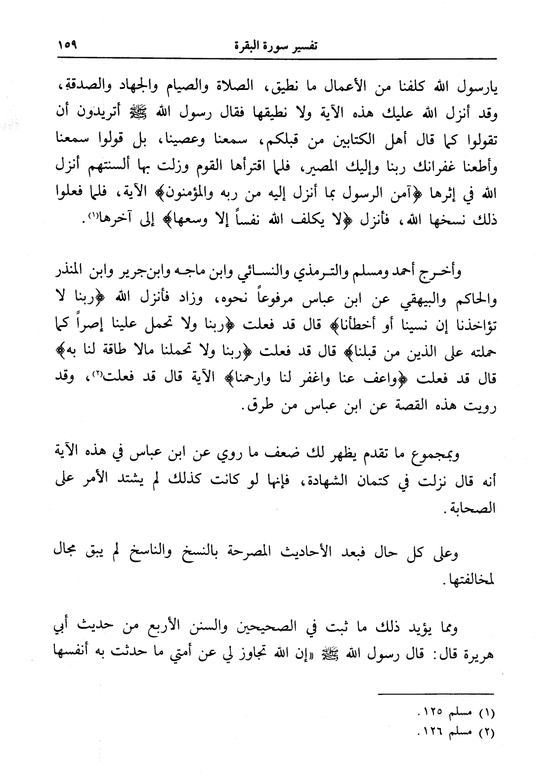 وأخرج أحمد ومسلم والترمذي والنسائي وابن ماجه وابن جرير وابن المنذر والحاكم والبيهقي عن ابن عباس مرفوعاً نحوه، وزاد فأنزل الله (ربنا لا تؤاخذنا إن نسينا أو أخطأنا) قال قد فعلت (ربنا ولا تحمل علينا إصراً كما حملته على الذين من قبلنا) قال قد فعلت (ربنا ولا تحملنا ما لا طاقة لنا به) قال قد فعلت (واعف عنا واغفر لنا وارحمنا) الآية قال قد فعلت (¬2)، وقد رويت هذه القصة عن ابن عباس من طرق.
