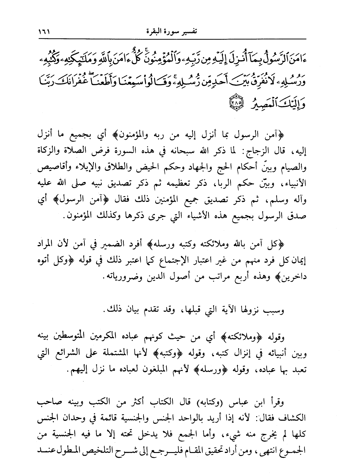 آَمَنَ الرَّسُولُ بِمَا أُنْزِلَ إِلَيْهِ مِنْ رَبِّهِ وَالْمُؤْمِنُونَ كُلٌّ آَمَنَ بِاللَّهِ وَمَلَائِكَتِهِ وَكُتُبِهِ وَرُسُلِهِ لَا نُفَرِّقُ بَيْنَ أَحَدٍ مِنْ رُسُلِهِ وَقَالُوا سَمِعْنَا وَأَطَعْنَا غُفْرَانَكَ رَبَّنَا وَإِلَيْكَ الْمَصِيرُ (285)