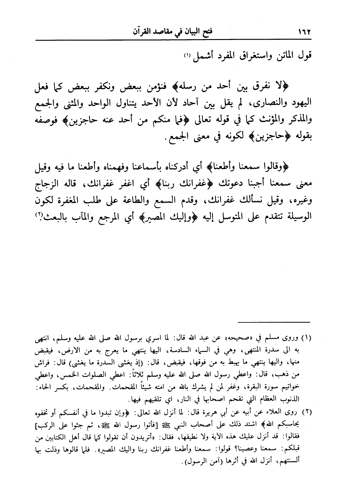 (لا نفرق بين أحد من رسله) فنؤمن ببعض ونكفر ببعض كما فعل اليهود والنصارى، لم يقل بين آحاد لأن الأحد يتناول الواحد والمثنى والجمع والمذكر والمؤنث كما في قوله تعالى (فما منكم من أحد عنه حاجزين) فوصفه بقوله (حاجزين) لكونه في معنى الجمع.