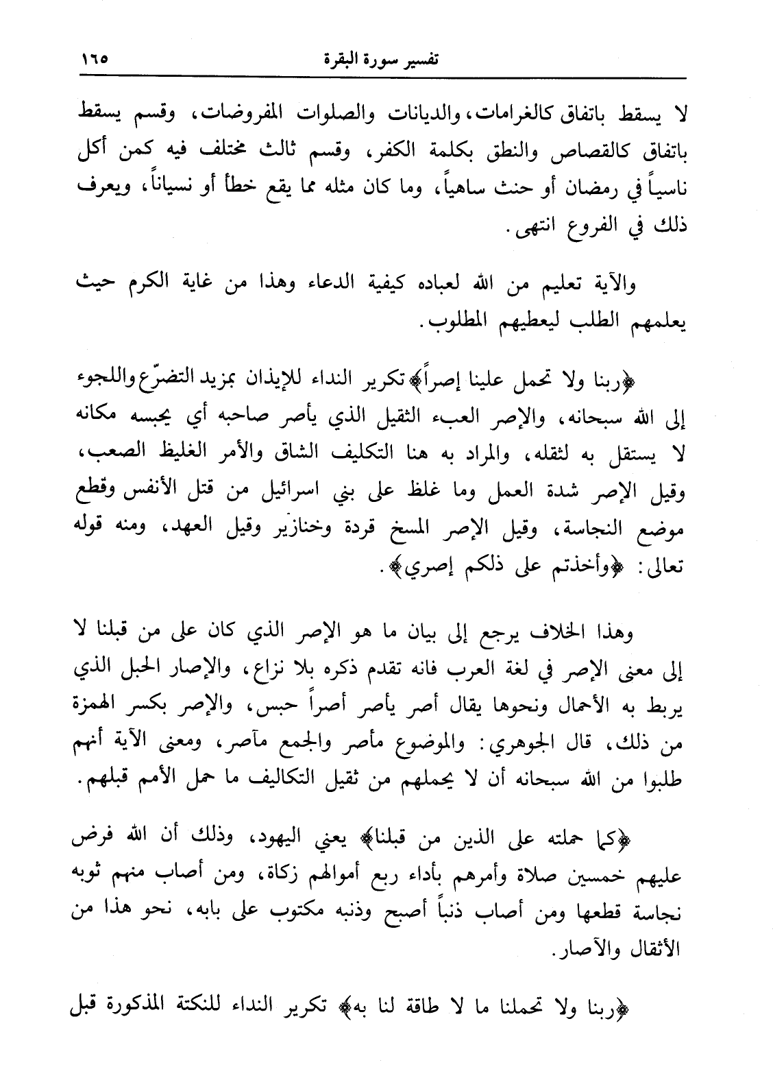 وهذا الخلاف يرجع إلى بيان ما هو الإصر الذي كان على من قبلنا لا إلى معنى الإصر في لغة العرب فإنه تقدم ذكره بلا نزاع، والإصار الحبل الذي يربط به الأحمال ونحوها يقال أصر يأصر أصراً حبس، والإصر بكسر الهمزة من ذلك، قال الجوهري: والوضوع مأصر والجمع مآصر، ومعنى الآية أنهم طلبوا من الله سبحانه أن لا يحملهم من ثقيل التكاليف ما حمل الأمم قبلهم.