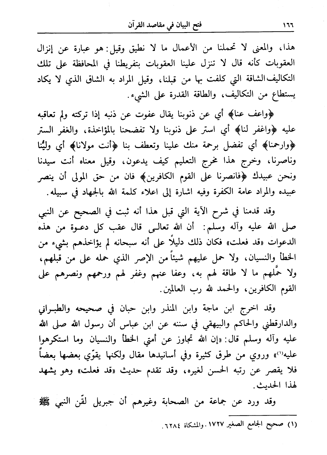 وقد قدمنا في شرح الآية التي قبل هذا أنه ثبت في الصحيح عن النبي صلى الله عليه وآله وسلم: أن الله تعالى قال عقب كل دعوة من هذه الدعوات " قد فعلت " فكان ذلك دليلاً على أنه سبحانه لم يؤاخذهم بشيء من الخطأ والنسيان، ولا حمل عليهم شيئاً من الإصر الذي حمله على من قبلهم، ولا حمَّلهم ما لا طاقة لهم به، وعفا عنهم وغفر لهم ورحمهم ونصرهم على القوم الكافرين، والحمد لله رب العالمين.