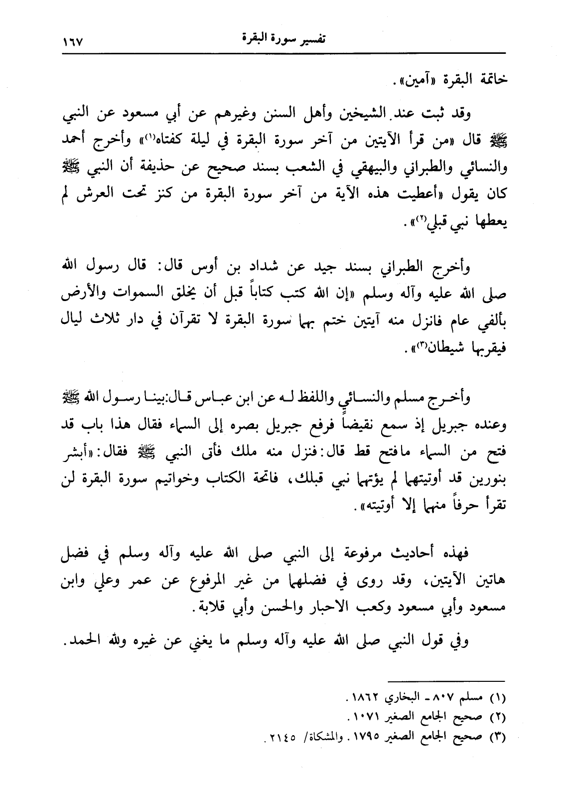 وقد ثبت عند الشيخين وأهل السنن وغيرهم عن أبي مسعود عن النبي - صلى الله عليه وسلم - قال " من قرأ الآيتين من آخر سورة البقرة في ليلة كفتاه (¬1) " وأخرج أحمد والنسائي والطبراني والبيهقي في الشعب بسند صحيح عن حذيفة أن النبي - صلى الله عليه وسلم - كان يقول " أعطيت هذه الآية من آخر سورة البقرة من كنز تحت العرش لم يعطها نبي قبلي (¬2) ".
