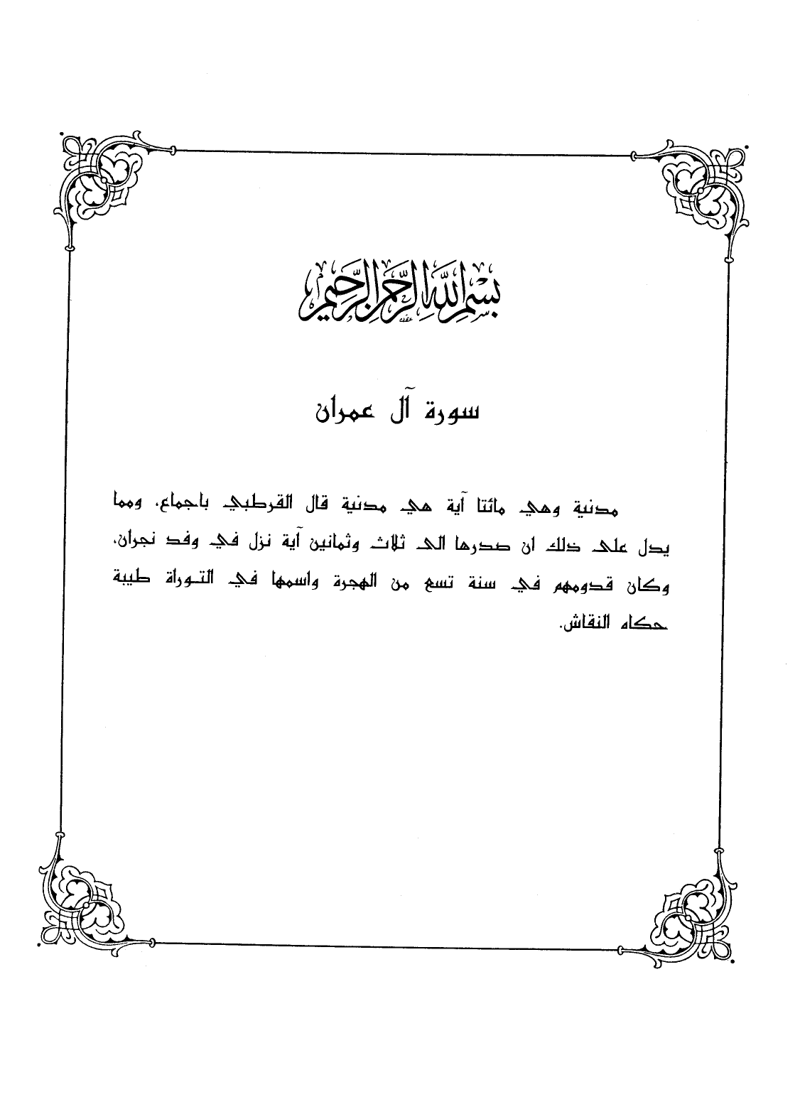 مدنية وهي مائتا آية هي مدنية قال القرطبي بإجماع. ومما يدل على ذلك أن صدرها إلى ثلاث وثمانين آية نزل في وفد نجران. وكان قدومهم في سنة تسع من الهجرة واسمها في التوراة طيبة حكاه النقاش.