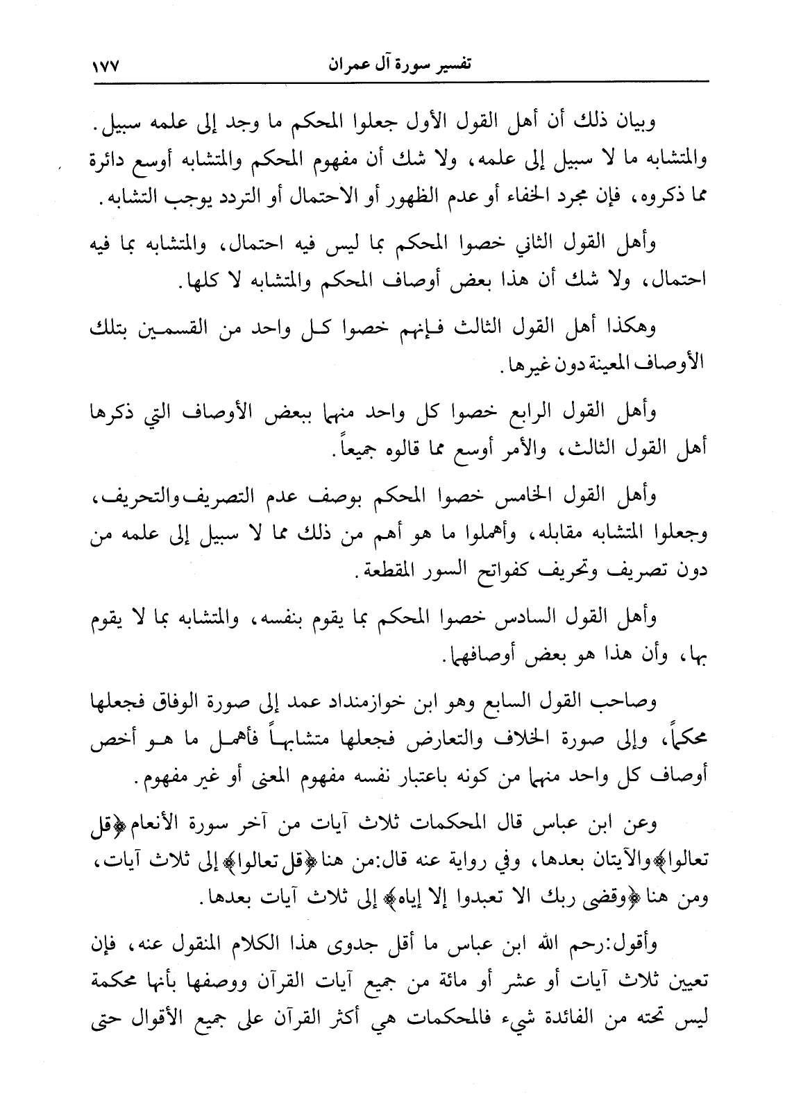 وأقول: رحم الله ابن عباس ما أقل جدوى هذا الكلام المنقول عنه، فإن تعيين ثلاث آيات أو عشر أو مائة من جميع آيات القرآن ووصفها بأنها محكمة ليس تحته من الفائدة شيء فالمحكمات هي أكثر القرآن على جميع الأقوال حتى