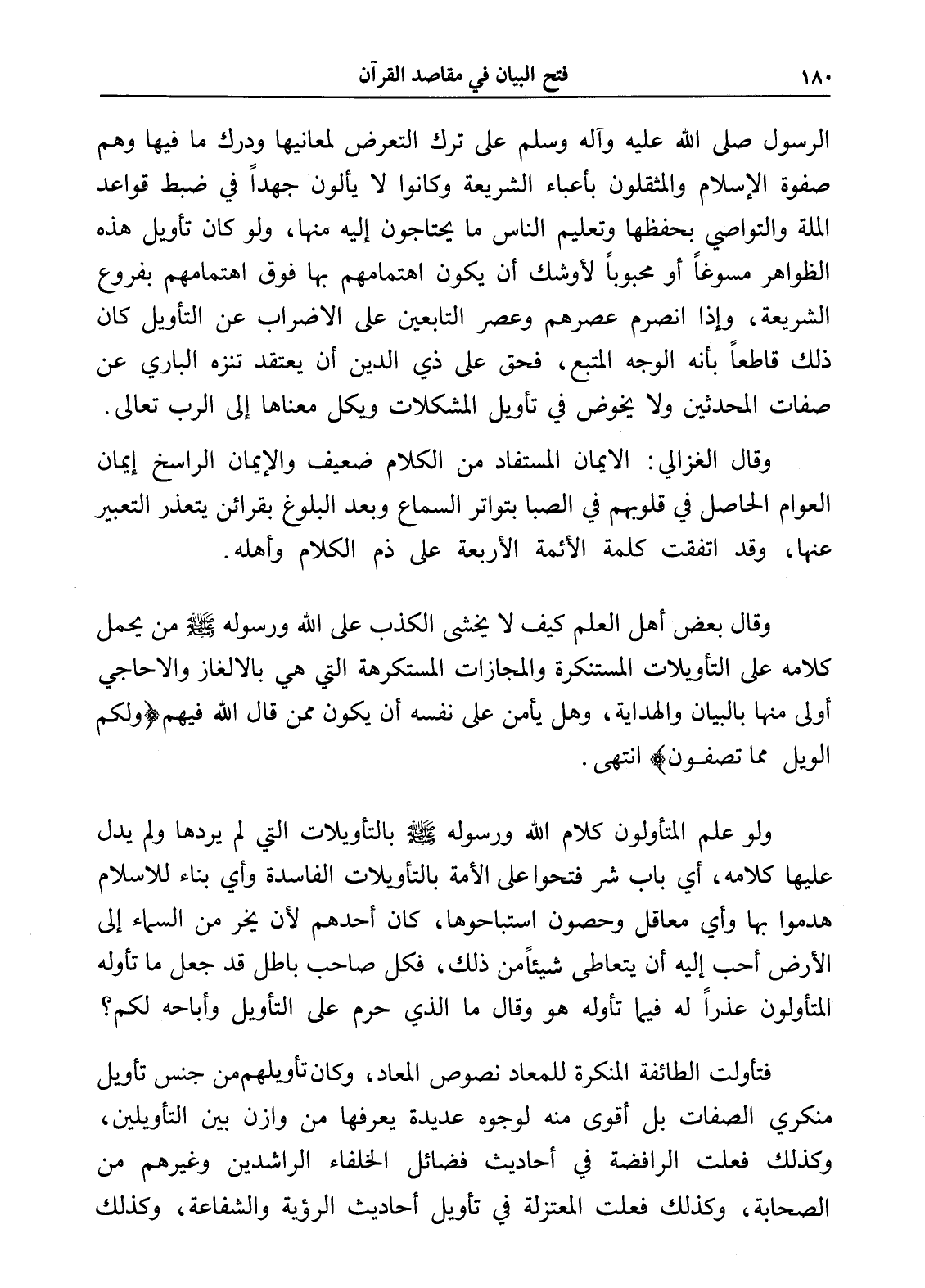 ولو علم المتأولون كلام الله ورسوله - صلى الله عليه وسلم - بالتأويلات التي لم يردها ولم يدل عليها كلامه، أي باب شر فتحوا على الأمة بالتأويلات الفاسدة وأي بناء للإسلام هدموا بها وأي معاقل وحصون استباحوها، كان أحدهم لأن يخر من السماء إلى الأرض أحب إليه أن يتعاطى شيئاً من ذلك، فكل صاحب باطل قد جعل ما تأوله المتأولون عذراً له فيما تأوله هو وقال ما الذي حرم على التأويل وأباحه لكم؟