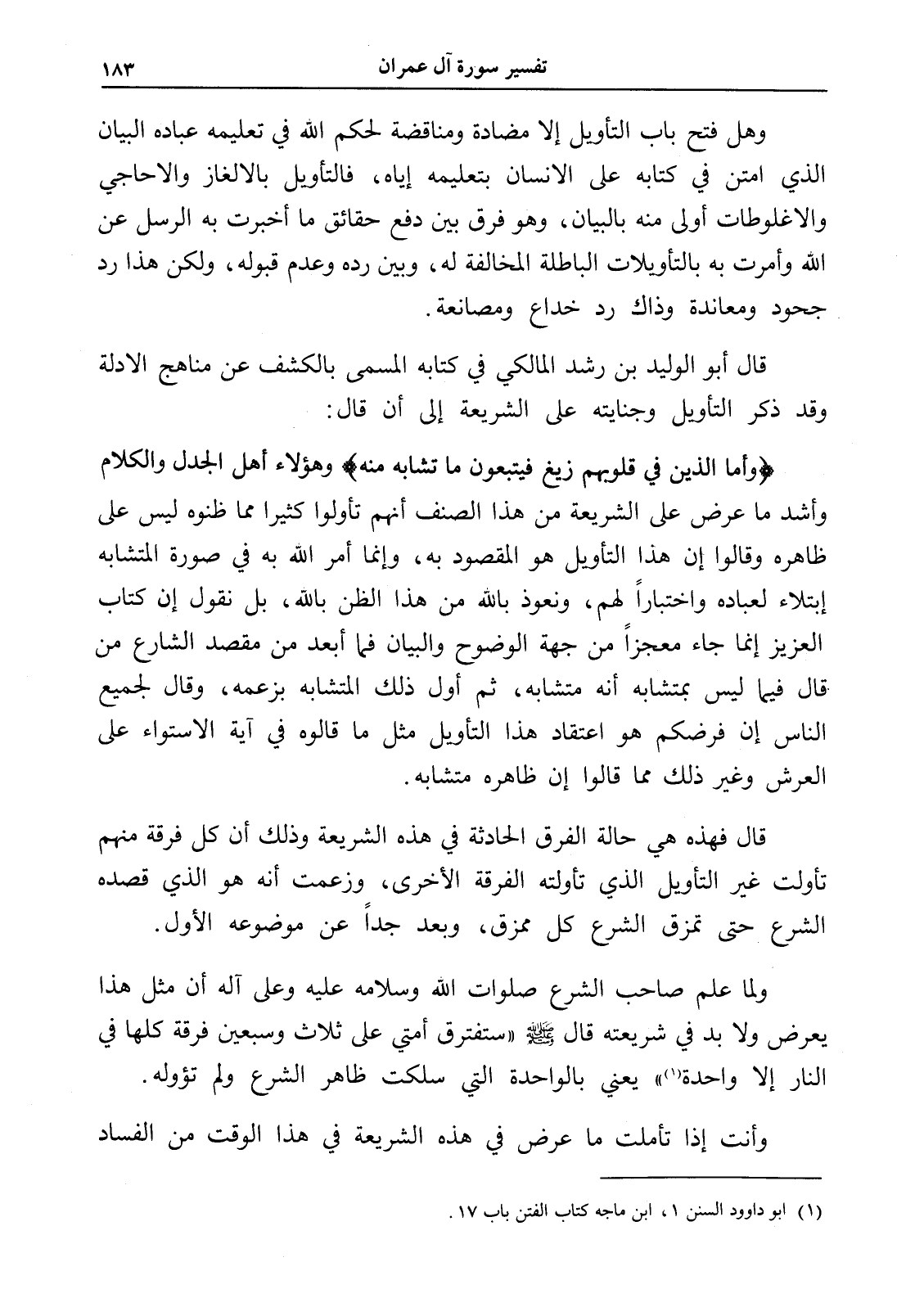 قال أبو الوليد بن رشد المالكي في كتابه المسمى بالكشف عن مناهج الأدلة وقد ذكر التأويل وجنايته على الشريعة إلى أن قال: