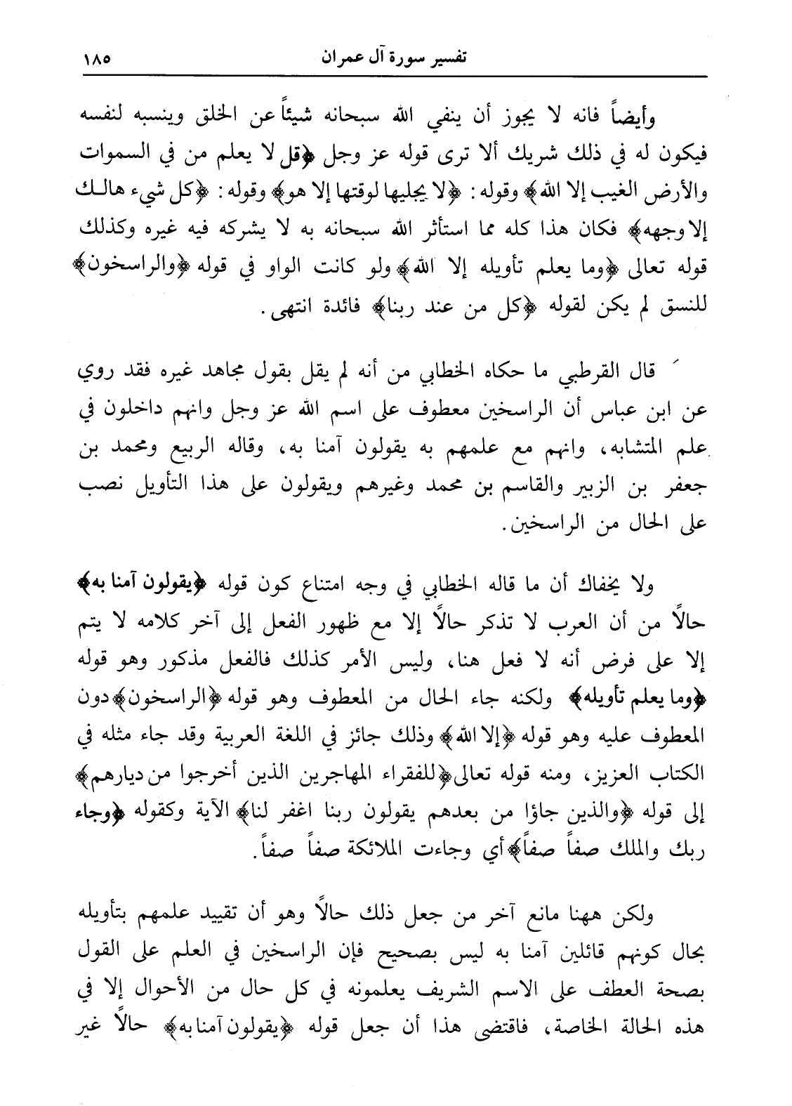 ولا يخفاك أن ما قاله الخطابي في وجه امتناع كون قوله (يقولون آمنا به) حالاً من أن العرب لا تذكر حالاً إلا مع ظهور الفعل إلى آخر كلامه لا يتم إلا على فرض أنه لا فعل هنا، وليس الأمر كذلك فالفعل مذكور وهو قوله (وما يعلم تأويله) ولكنه جاء الحال من المعطوف وهو قوله (الراسخون) دون المعطوف عليه وهو قوله (إلا الله) وذلك جائز في اللغة العربية وقد جاء مثله في الكتاب العزيز، ومنه قوله تعالى (للفقراء المهاجرين الذين أخرجوا من ديارهم) إلى قوله (والذين جاؤا من بعدهم يقولون ربنا اغفر لنا) الآية وكقوله (وجاء ربك والملك صفاً صفاً) أي وجاءت الملائكة صفاً صفاً.