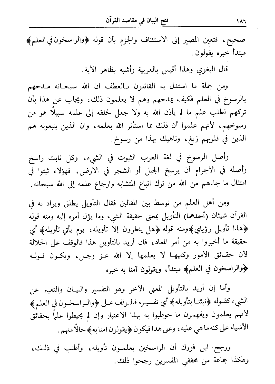 ورجح ابن فورك أن الراسخين يعلمون تأويله، وأطنب في ذلك، وهكذا جماعة من محققي المفسرين رجحوا ذلك.