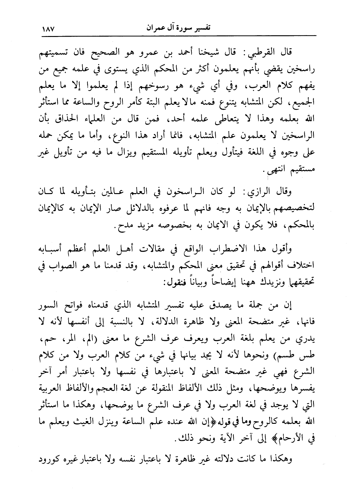 قال القرطبي: قال شيخنا أحمد بن عمرو هو الصحيح فإن تسميتهم راسخين يقضي بأنهم يعلمون أكثر من المحكم الذي يستوى في علمه جميع من يفهم كلام العرب، وفي أي شيء هو رسوخهم إذا لم يعلموا إلا ما يعلم الجميع، لكن المتشابه يتنوع فمنه ما لا يعلم البتة كأمر الروح والساعة مما استأثر الله بعلمه وهذا لا يتعاطى علمه أحد، فمن قال من العلماء الحذاق بأن الراسخين لا يعلمون علم التشابه، فإنما أراد هذا النوع، وأما ما يمكن حمله على وجوه في اللغة فيتأول ويعلم تأويله المستقيم ويزال ما فيه من تأويل غير مستقيم انتهى.