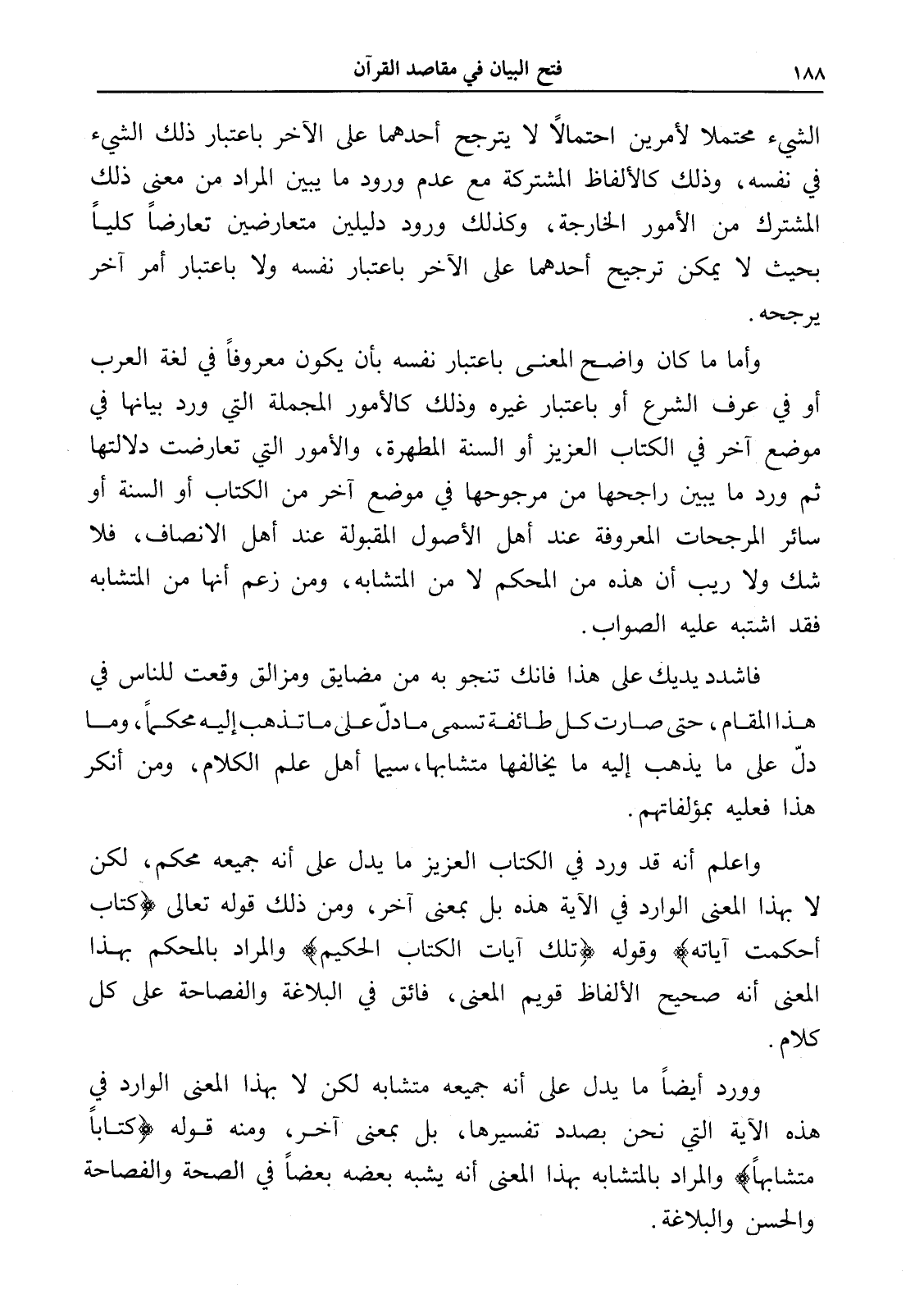 فاشدد يديك على هذا فإنك تنجو به من مضايق ومزالق وقعت للناس في هذا المقام، حتى صارت كل طائفة تسمى ما دلّ على ما تذهب إليه محكماً، وما دلّ على ما يذهب إليه ما يخالفها متشابها، سيما أهل علم الكلام، ومن أنكر هذا فعليه بمؤلفاتهم.
