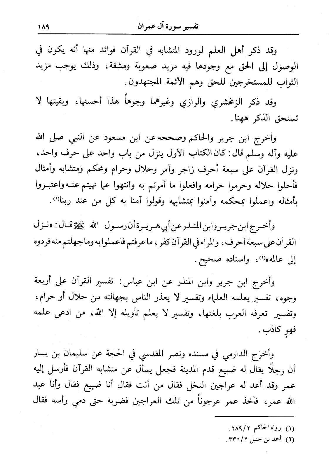 وأخرج ابن جرير والحاكم وصححه عن ابن مسعود عن النبي صلى الله عليه وآله وسلم قال: كان الكتاب الأول ينزل من باب واحد على حرف واحد، ونزل القرآن على سبعة أحرف زاجر وآمر وحلال وحرام ومحكم ومتشابه وأمثال فأحلوا حلاله وحرموا حرامه وافعلوا ما أمرتم به وانتهوا عما نهيتم عنه واعتبروا بأمثاله واعملوا بمحكمه وآمنوا بمتشابهه وقولوا آمنا به كل من عند ربنا (¬1).