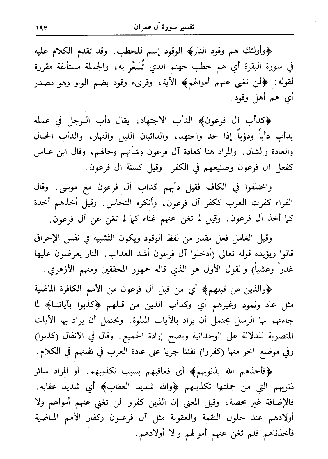 واختلفوا في الكاف فقيل دأبهم كدأب آل فرعون مع موسى. وقال الفراء كفرت العرب ككفر آل فرعون، وأنكره النحاس. وقيل أخذهم أخذة كما أخذ آل فرعون. وقيل لم تغن عنهم غناء كما لم تغن عن آل فرعون.