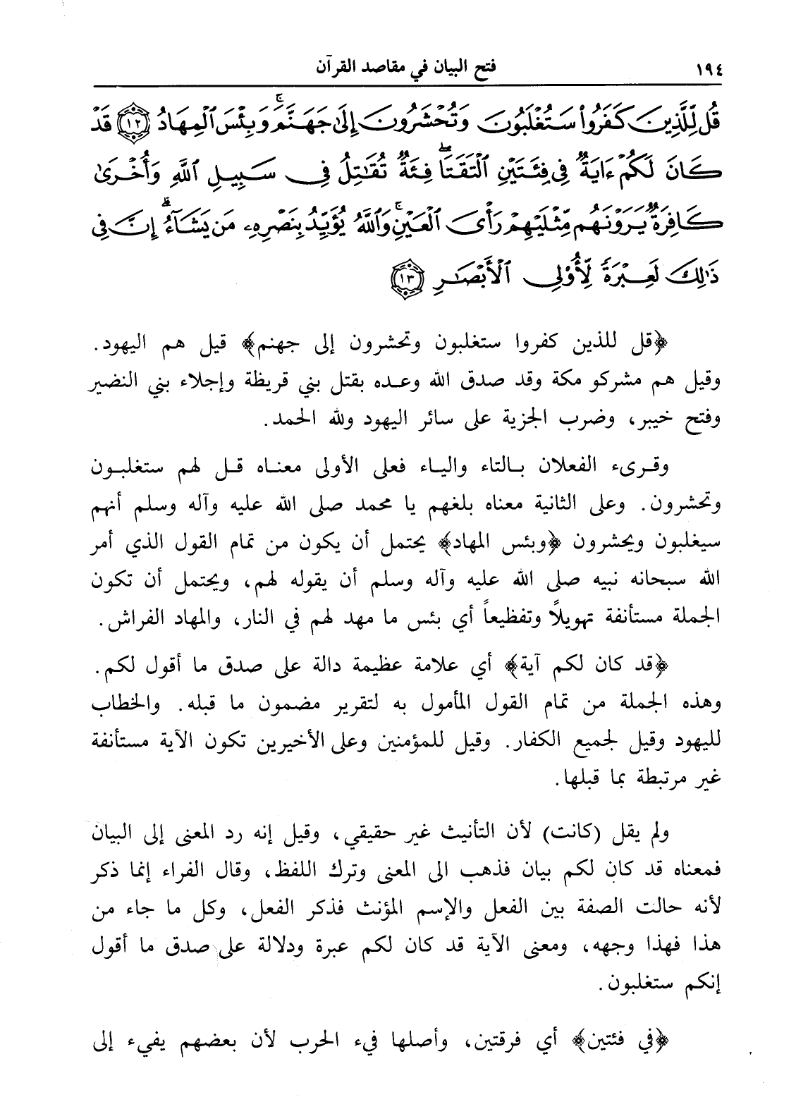 قُلْ لِلَّذِينَ كَفَرُوا سَتُغْلَبُونَ وَتُحْشَرُونَ إِلَى جَهَنَّمَ وَبِئْسَ الْمِهَادُ (12) قَدْ كَانَ لَكُمْ آَيَةٌ فِي فِئَتَيْنِ الْتَقَتَا فِئَةٌ تُقَاتِلُ فِي سَبِيلِ اللَّهِ وَأُخْرَى كَافِرَةٌ يَرَوْنَهُمْ مِثْلَيْهِمْ رَأْيَ الْعَيْنِ وَاللَّهُ يُؤَيِّدُ بِنَصْرِهِ مَنْ يَشَاءُ إِنَّ فِي ذَلِكَ لَعِبْرَةً لِأُولِي الْأَبْصَارِ (13)