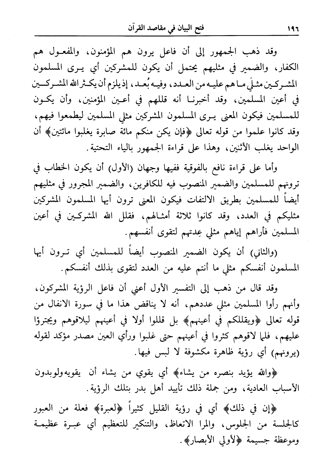 وقد قال من ذهب إلى التفسير الأول أعني أن فاعل الرؤية المشركون، وأنهم رأوا المسلمين مثلي عددهم، أنه لا يناقض هذا ما في سورة الأنفال من قوله تعالى (ويقللكم في أعينهم) بل قللوا أولا في أعينهم ليلاقوهم ويجترؤا عليهم، فلما لاقوهم كثروا في أعينهم حتى غلبوا ورأي العين مصدر مؤكد لقوله (يرونهم) أي رؤية ظاهرة مكشوفة لا لبس فيها.