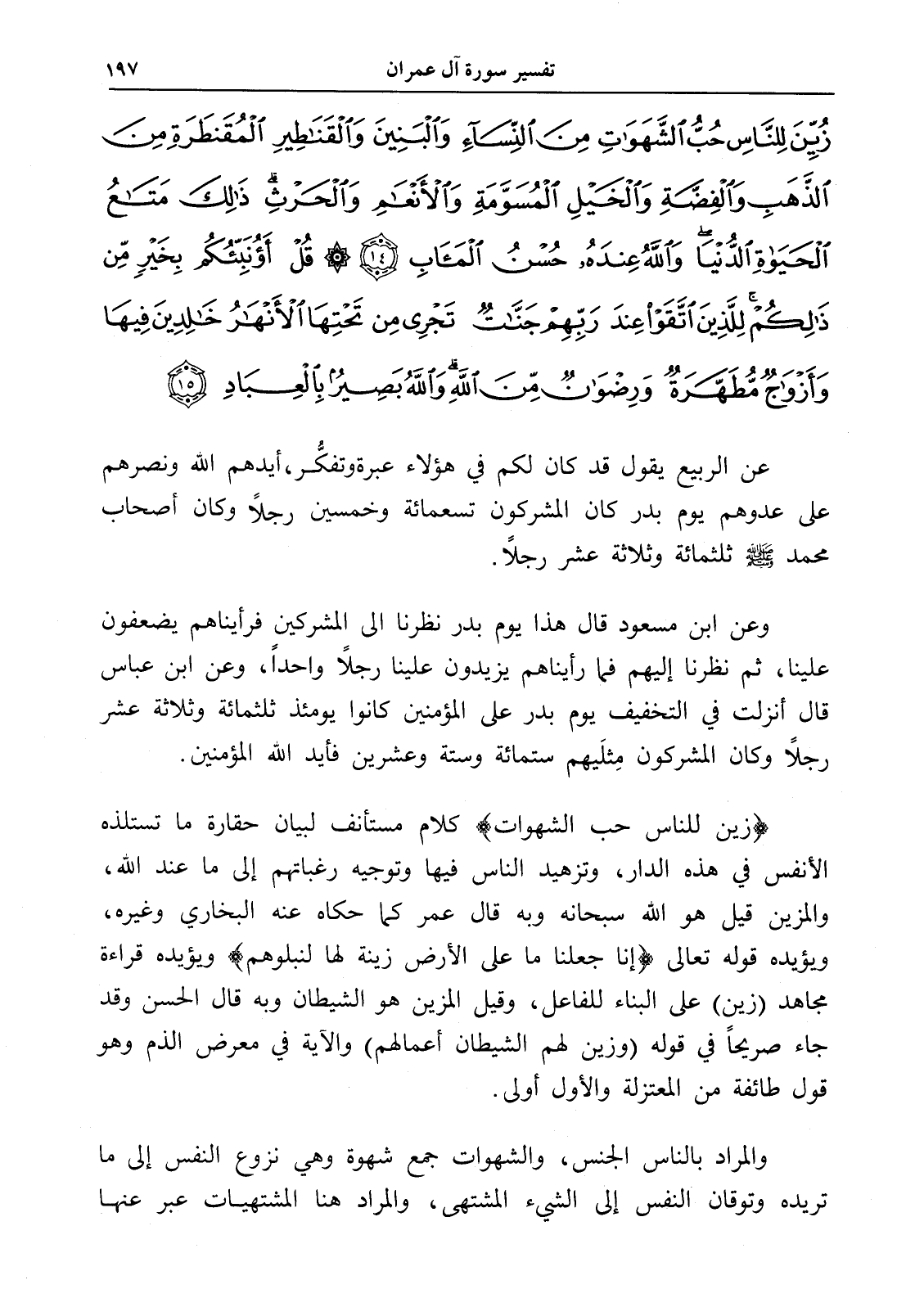 زُيِّنَ لِلنَّاسِ حُبُّ الشَّهَوَاتِ مِنَ النِّسَاءِ وَالْبَنِينَ وَالْقَنَاطِيرِ الْمُقَنْطَرَةِ مِنَ الذَّهَبِ وَالْفِضَّةِ وَالْخَيْلِ الْمُسَوَّمَةِ وَالْأَنْعَامِ وَالْحَرْثِ ذَلِكَ مَتَاعُ الْحَيَاةِ الدُّنْيَا وَاللَّهُ عِنْدَهُ حُسْنُ الْمَآَبِ (14) قُلْ أَؤُنَبِّئُكُمْ بِخَيْرٍ مِنْ ذَلِكُمْ لِلَّذِينَ اتَّقَوْا عِنْدَ رَبِّهِمْ جَنَّاتٌ تَجْرِي مِنْ تَحْتِهَا الْأَنْهَارُ خَالِدِينَ فِيهَا وَأَزْوَاجٌ مُطَهَّرَةٌ وَرِضْوَانٌ مِنَ اللَّهِ وَاللَّهُ بَصِيرٌ بِالْعِبَادِ (15)