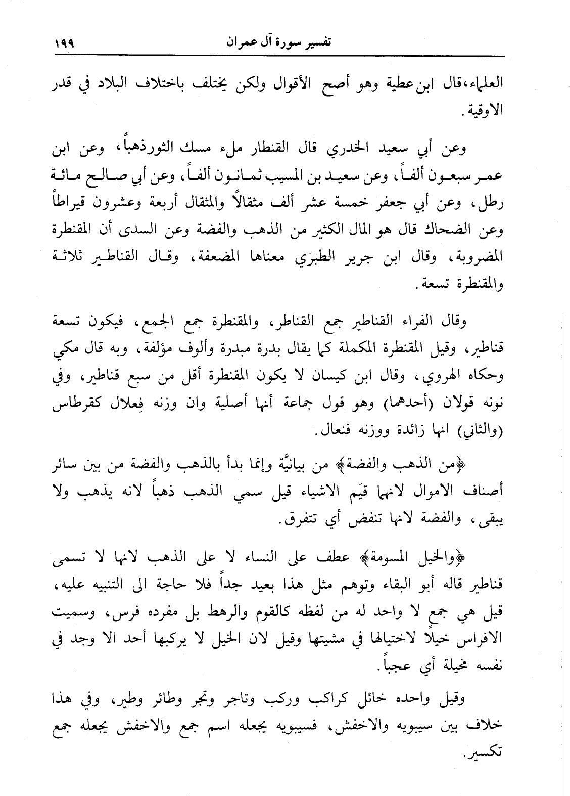 وعن أبي سعيد الخدري قال القنطار ملء مسك الثور ذهباً، وعن ابن عمر سبعون ألفاً، وعن سعيد بن المسيب ثمانون ألفاً، وعن أبي صالح مائة رطل، وعن أبي جعفر خمسة عشر ألف مثقالاً والمثقال أربعة وعشرون قيراطاً وعن الضحاك قال هو المال الكثير من الذهب والفضة وعن السدى أن المقنطرة المضروبة، وقال ابن جرير الطبري معناها المضعفة، وقال القناطير ثلاثة والمقنطرة تسعة.
