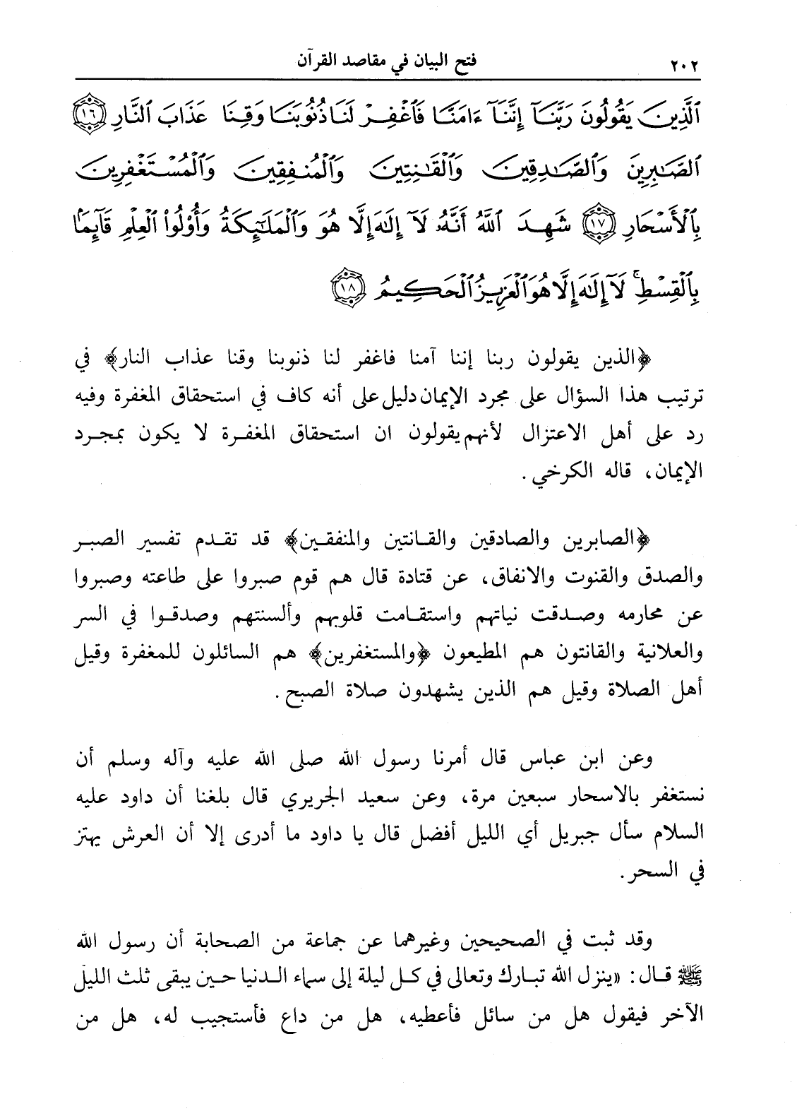الَّذِينَ يَقُولُونَ رَبَّنَا إِنَّنَا آَمَنَّا فَاغْفِرْ لَنَا ذُنُوبَنَا وَقِنَا عَذَابَ النَّارِ (16) الصَّابِرِينَ وَالصَّادِقِينَ وَالْقَانِتِينَ وَالْمُنْفِقِينَ وَالْمُسْتَغْفِرِينَ بِالْأَسْحَارِ (17) شَهِدَ اللَّهُ أَنَّهُ لَا إِلَهَ إِلَّا هُوَ وَالْمَلَائِكَةُ وَأُولُو الْعِلْمِ قَائِمًا بِالْقِسْطِ لَا إِلَهَ إِلَّا هُوَ الْعَزِيزُ الْحَكِيمُ (18)
