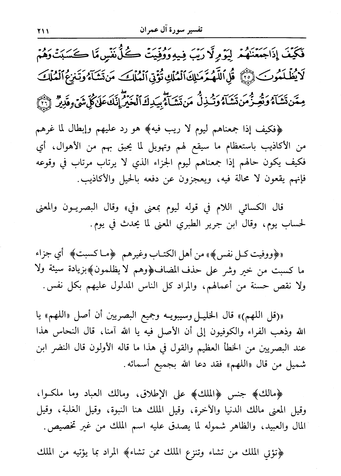 فَكَيْفَ إِذَا جَمَعْنَاهُمْ لِيَوْمٍ لَا رَيْبَ فِيهِ وَوُفِّيَتْ كُلُّ نَفْسٍ مَا كَسَبَتْ وَهُمْ لَا يُظْلَمُونَ (25) قُلِ اللَّهُمَّ مَالِكَ الْمُلْكِ تُؤْتِي الْمُلْكَ مَنْ تَشَاءُ وَتَنْزِعُ الْمُلْكَ مِمَّنْ تَشَاءُ وَتُعِزُّ مَنْ تَشَاءُ وَتُذِلُّ مَنْ تَشَاءُ بِيَدِكَ الْخَيْرُ إِنَّكَ عَلَى كُلِّ شَيْءٍ قَدِيرٌ (26)
