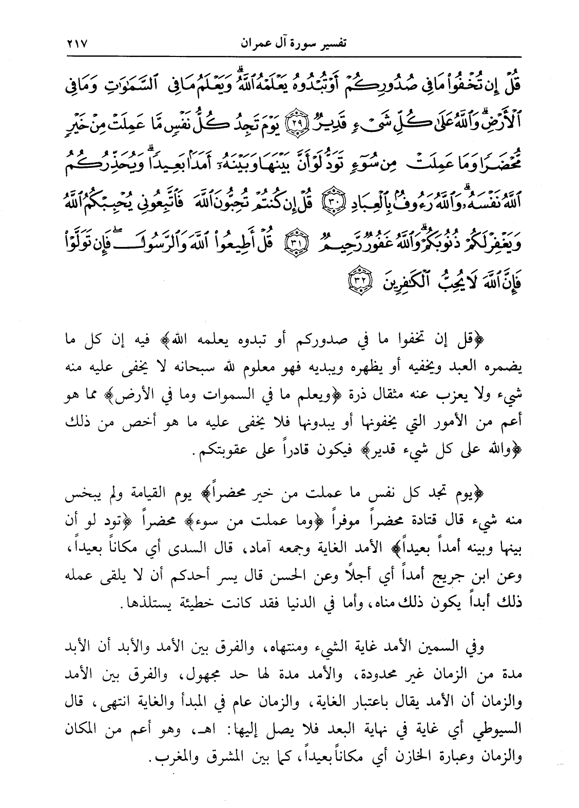 قُلْ إِنْ تُخْفُوا مَا فِي صُدُورِكُمْ أَوْ تُبْدُوهُ يَعْلَمْهُ اللَّهُ وَيَعْلَمُ مَا فِي السَّمَاوَاتِ وَمَا فِي الْأَرْضِ وَاللَّهُ عَلَى كُلِّ شَيْءٍ قَدِيرٌ (29) يَوْمَ تَجِدُ كُلُّ نَفْسٍ مَا عَمِلَتْ مِنْ خَيْرٍ مُحْضَرًا وَمَا عَمِلَتْ مِنْ سُوءٍ تَوَدُّ لَوْ أَنَّ بَيْنَهَا وَبَيْنَهُ أَمَدًا بَعِيدًا وَيُحَذِّرُكُمُ اللَّهُ نَفْسَهُ وَاللَّهُ رَءُوفٌ بِالْعِبَادِ (30) قُلْ إِنْ كُنْتُمْ تُحِبُّونَ اللَّهَ فَاتَّبِعُونِي يُحْبِبْكُمُ اللَّهُ وَيَغْفِرْ لَكُمْ ذُنُوبَكُمْ وَاللَّهُ غَفُورٌ رَحِيمٌ (31) قُلْ أَطِيعُوا اللَّهَ وَالرَّسُولَ فَإِنْ تَوَلَّوْا فَإِنَّ اللَّهَ لَا يُحِبُّ الْكَافِرِينَ (32)