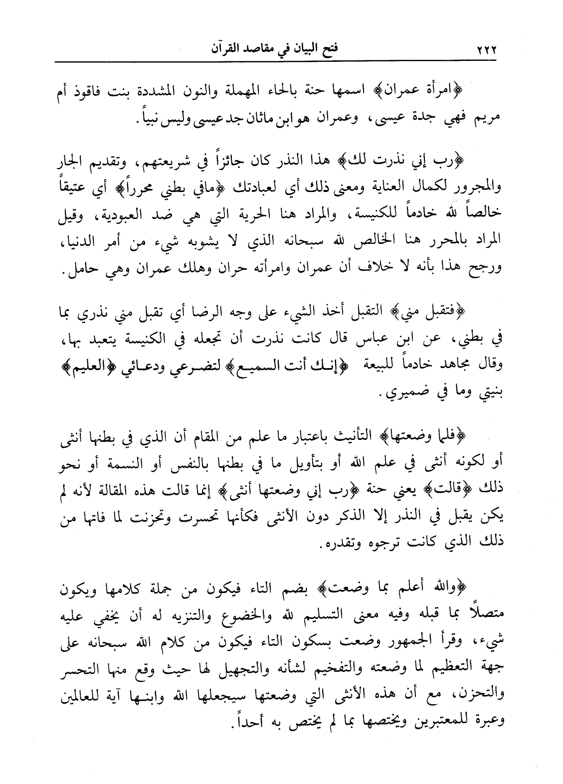 (امرأة عمران) اسمها حنة بالحاء المهملة والنون المشددة بنت فاقوذ أم مريم فهي جدة عيسى، وعمران هو ابن ماثان جد عيسى وليس نبياً.