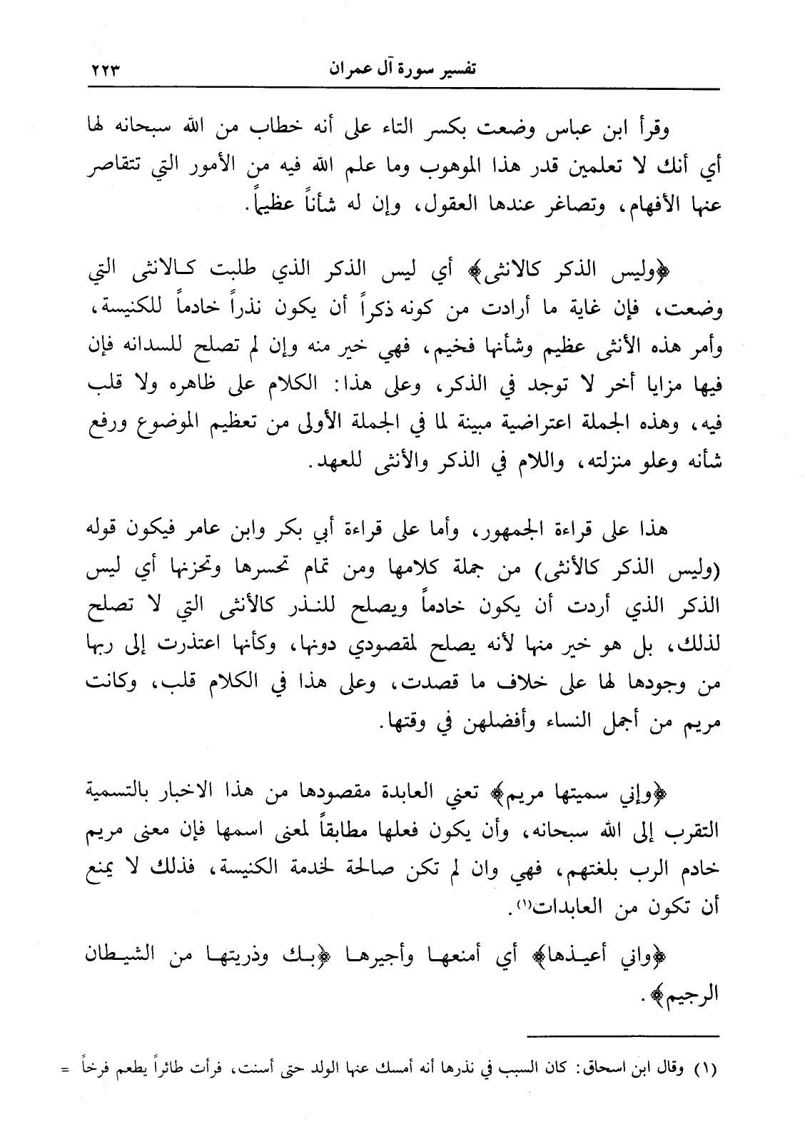 هذا على قراءة الجمهور، وأما على قراءة أبي بكر وابن عامر فيكون قوله (وليس الذكر كالأنثى) من جملة كلامها ومن تمام تحسرها وتحزنها أي ليس الذكر الذي أردت أن يكون خادماً ويصلح للنذر كالأنثى التي لا تصلح لذلك، بل هو خير منها لأنه يصلح لمقصودي دونها، وكأنها اعتذرت إلى ربها من وجودها لها على خلاف ما قصدت، وعلى هذا في الكلام قلب، وكانت مريم من أجمل النساء وأفضلهن في وقتها.