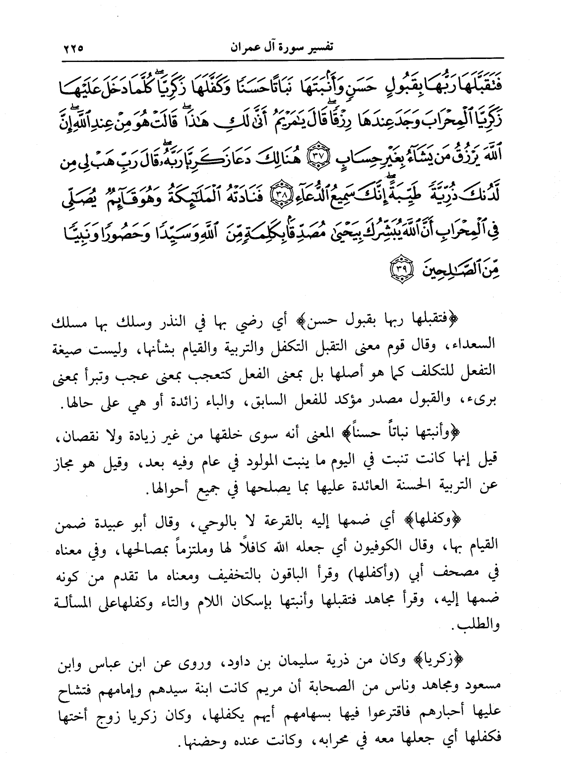 فَتَقَبَّلَهَا رَبُّهَا بِقَبُولٍ حَسَنٍ وَأَنْبَتَهَا نَبَاتًا حَسَنًا وَكَفَّلَهَا زَكَرِيَّا كُلَّمَا دَخَلَ عَلَيْهَا زَكَرِيَّا الْمِحْرَابَ وَجَدَ عِنْدَهَا رِزْقًا قَالَ يَا مَرْيَمُ أَنَّى لَكِ هَذَا قَالَتْ هُوَ مِنْ عِنْدِ اللَّهِ إِنَّ اللَّهَ يَرْزُقُ مَنْ يَشَاءُ بِغَيْرِ حِسَابٍ (37) هُنَالِكَ دَعَا زَكَرِيَّا رَبَّهُ قَالَ رَبِّ هَبْ لِي مِنْ لَدُنْكَ ذُرِّيَّةً طَيِّبَةً إِنَّكَ سَمِيعُ الدُّعَاءِ (38) فَنَادَتْهُ الْمَلَائِكَةُ وَهُوَ قَائِمٌ يُصَلِّي فِي الْمِحْرَابِ أَنَّ اللَّهَ يُبَشِّرُكَ بِيَحْيَى مُصَدِّقًا بِكَلِمَةٍ مِنَ اللَّهِ وَسَيِّدًا وَحَصُورًا وَنَبِيًّا مِنَ الصَّالِحِينَ (39)