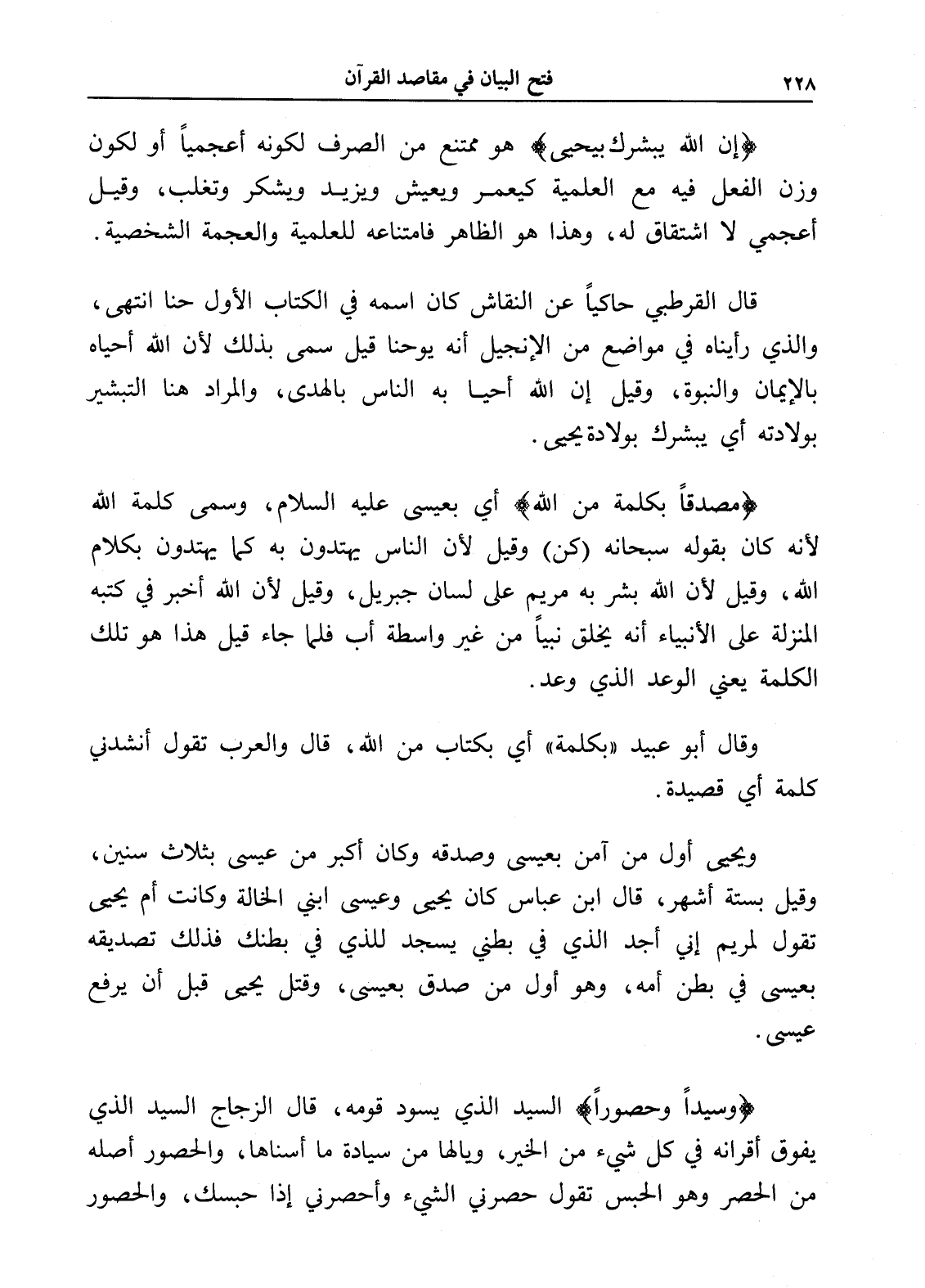 (وسيداً وحصوراً) السيد الذي يسود قومه، قال الزجاج السيد الذي يفوق أقرانه في كل شيء من الخير، ويا لها من سيادة ما أسناها، والحصور أصله من الحصر وهو الحبس تقول حصرني الشيء وأحصرني إذا حبسك، والحصور