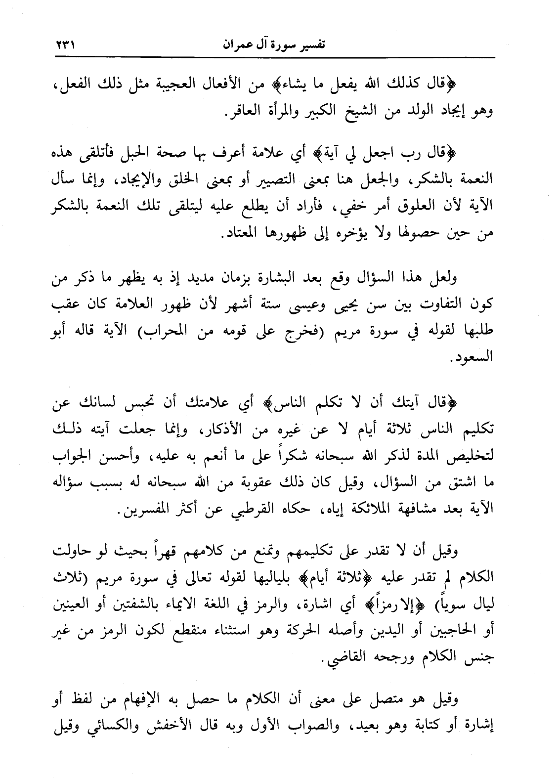 (قال رب اجعل لي آية) أي علامة أعرف بها صحة الحبل فأتلقى هذه النعمة بالشكر، والجعل هنا بمعنى التصيير أو بمعنى الخلق والإيجاد، وإنما سأل الآية لأن العلوق أمر خفي، فأراد أن يطلع عليه ليتلقى تلك النعمة بالشكر من حين حصولها ولا يؤخره إلى ظهورها المعتاد.