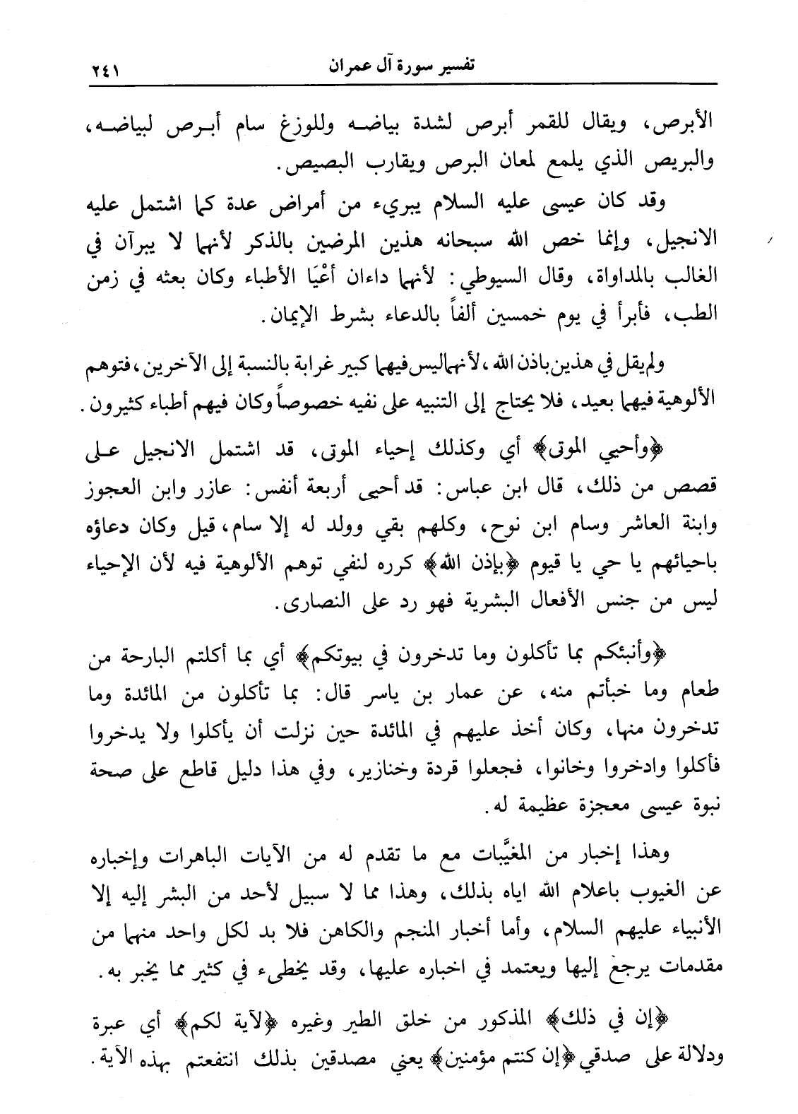 وقد كان عيسى عليه السلام يبريء من أمراض عدة كما اشتمل عليه الإنجيل، وإنما خص الله سبحانه هذين المرضين بالذكر لأنهما لا يبرآن في الغالب بالمداواة، وقال السيوطي: لأنهما داءان أعْيَا الأطباء وكان بعثه في زمن الطب، فأبرأ في يوم خمسين ألفاً بالدعاء بشرط الإيمان.