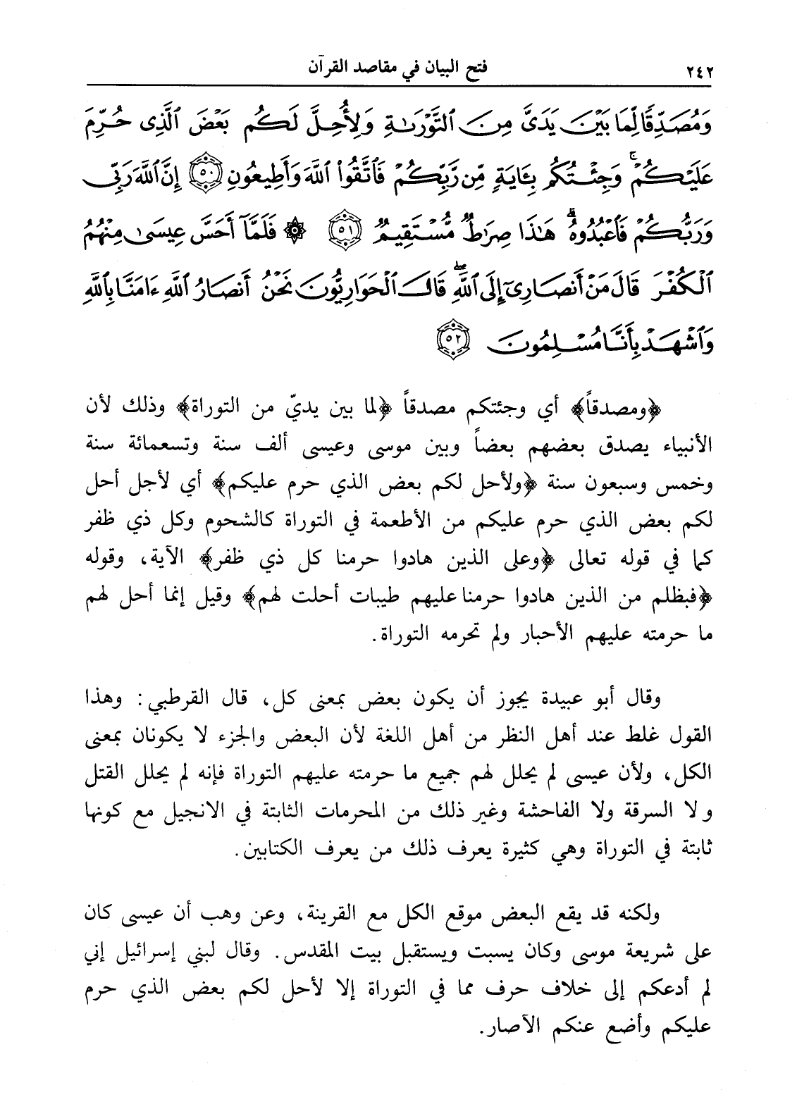 وَمُصَدِّقًا لِمَا بَيْنَ يَدَيَّ مِنَ التَّوْرَاةِ وَلِأُحِلَّ لَكُمْ بَعْضَ الَّذِي حُرِّمَ عَلَيْكُمْ وَجِئْتُكُمْ بِآَيَةٍ مِنْ رَبِّكُمْ فَاتَّقُوا اللَّهَ وَأَطِيعُونِ (50) إِنَّ اللَّهَ رَبِّي وَرَبُّكُمْ فَاعْبُدُوهُ هَذَا صِرَاطٌ مُسْتَقِيمٌ (51) فَلَمَّا أَحَسَّ عِيسَى مِنْهُمُ الْكُفْرَ قَالَ مَنْ أَنْصَارِي إِلَى اللَّهِ قَالَ الْحَوَارِيُّونَ نَحْنُ أَنْصَارُ اللَّهِ آَمَنَّا بِاللَّهِ وَاشْهَدْ بِأَنَّا مُسْلِمُونَ (52)