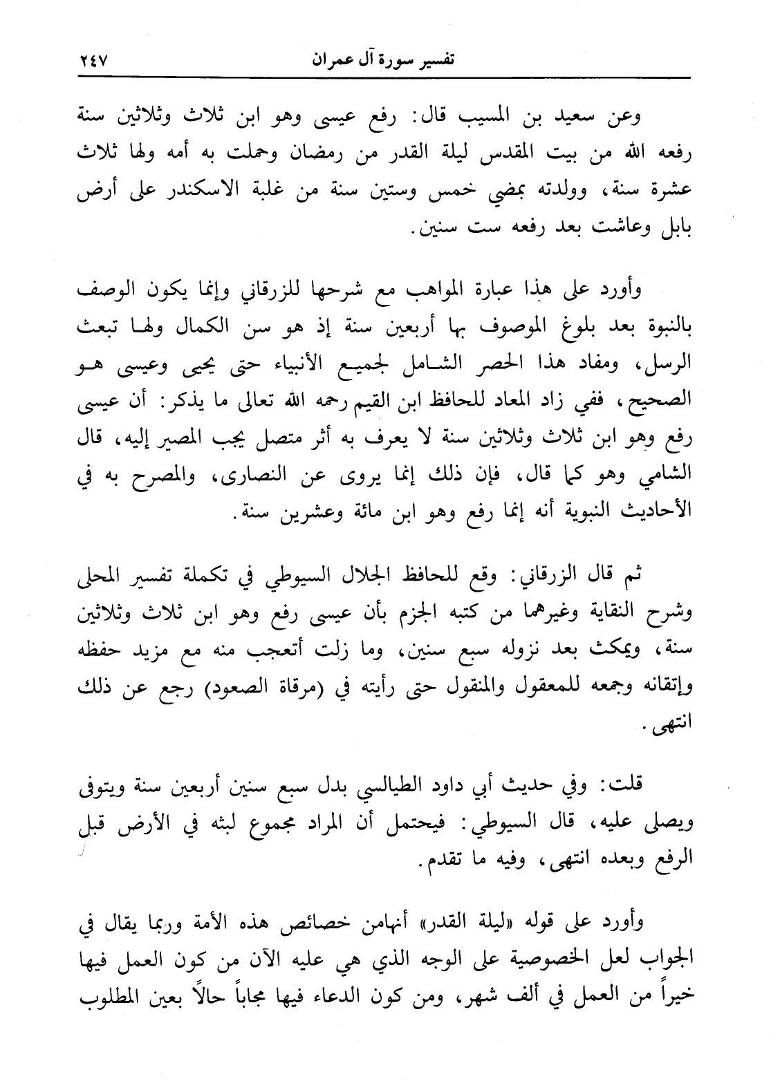 ثم قال الزرقاني: وقع للحافظ الجلال السيوطي في تكملة تفسير المحلى وشرح النقاية وغيرهما من كتبه الجزم بأن عيسى رفع وهو ابن ثلاث وثلاثين سنة، ويمكث بعد نزوله سبع سنين، وما زلت أتعجب منه مع مزيد حفظه وإتقانه وجمعه للمعقول والمنقول حتى رأيته في (مرقاة الصعود) رجع عن ذلك انتهى.