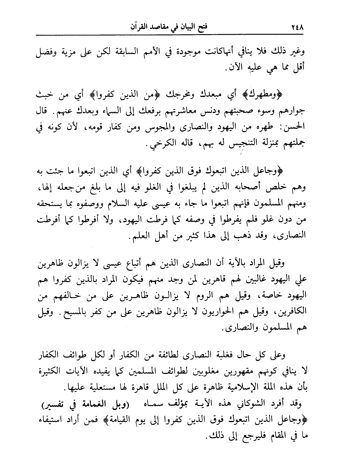 وقد أفرد الشوكاني هذه الآية بمؤلف سماه (وبل الغمامة في تفسير) (وجاعل الذين اتبعوك فوق الذين كفروا إلى يوم القيامة) فمن أراد استيفاء ما في المقام فليرجع إلى ذلك.