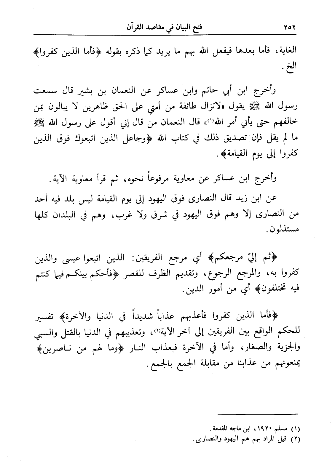 وأخرج ابن أبي حاتم وابن عساكر عن النعمان بن بشير قال سمعت رسول الله - صلى الله عليه وسلم - يقول " لا تزال طائفة من أمتي على الحق ظاهرين لا يبالون بمن خالفهم حتى يأتي أمر الله (¬1) " قال النعمان من قال إني أقول على رسول الله - صلى الله عليه وسلم - ما لم يقل فإن تصديق ذلك في كتاب الله (وجاعل الذين اتبعوك فوق الذين كفروا إلى يوم القيامة).