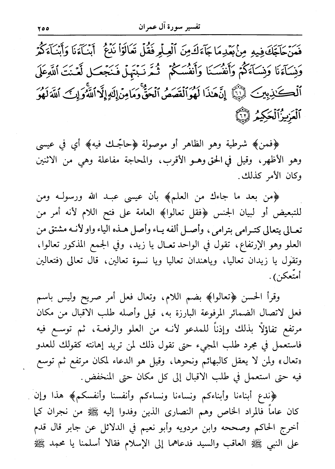 فَمَنْ حَاجَّكَ فِيهِ مِنْ بَعْدِ مَا جَاءَكَ مِنَ الْعِلْمِ فَقُلْ تَعَالَوْا نَدْعُ أَبْنَاءَنَا وَأَبْنَاءَكُمْ وَنِسَاءَنَا وَنِسَاءَكُمْ وَأَنْفُسَنَا وَأَنْفُسَكُمْ ثُمَّ نَبْتَهِلْ فَنَجْعَلْ لَعْنَةَ اللَّهِ عَلَى الْكَاذِبِينَ (61) إِنَّ هَذَا لَهُوَ الْقَصَصُ الْحَقُّ وَمَا مِنْ إِلَهٍ إِلَّا اللَّهُ وَإِنَّ اللَّهَ لَهُوَ الْعَزِيزُ الْحَكِيمُ (62)