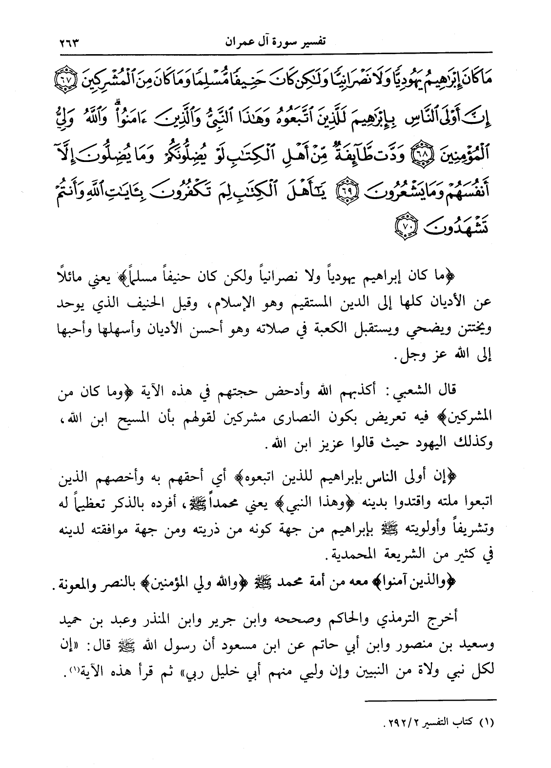 مَا كَانَ إِبْرَاهِيمُ يَهُودِيًّا وَلَا نَصْرَانِيًّا وَلَكِنْ كَانَ حَنِيفًا مُسْلِمًا وَمَا كَانَ مِنَ الْمُشْرِكِينَ (67) إِنَّ أَوْلَى النَّاسِ بِإِبْرَاهِيمَ لَلَّذِينَ اتَّبَعُوهُ وَهَذَا النَّبِيُّ وَالَّذِينَ آَمَنُوا وَاللَّهُ وَلِيُّ الْمُؤْمِنِينَ (68) وَدَّتْ طَائِفَةٌ مِنْ أَهْلِ الْكِتَابِ لَوْ يُضِلُّونَكُمْ وَمَا يُضِلُّونَ إِلَّا أَنْفُسَهُمْ وَمَا يَشْعُرُونَ (69) يَا أَهْلَ الْكِتَابِ لِمَ تَكْفُرُونَ بِآَيَاتِ اللَّهِ وَأَنْتُمْ تَشْهَدُونَ (70)