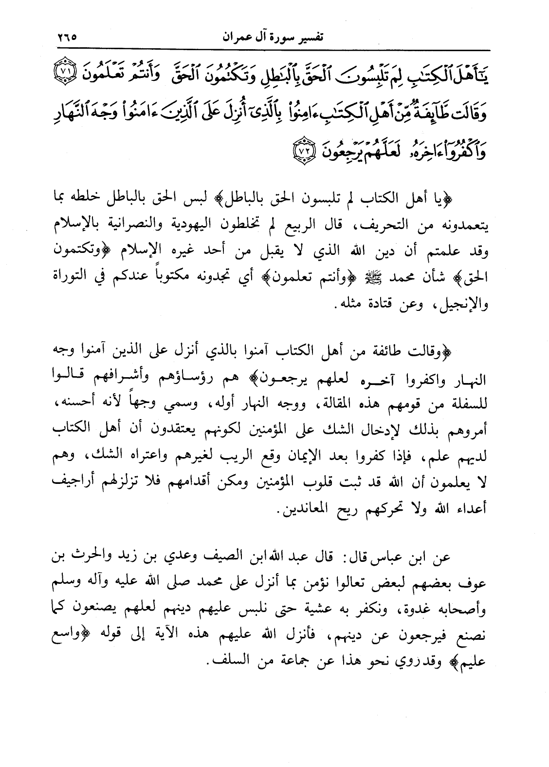 يَا أَهْلَ الْكِتَابِ لِمَ تَلْبِسُونَ الْحَقَّ بِالْبَاطِلِ وَتَكْتُمُونَ الْحَقَّ وَأَنْتُمْ تَعْلَمُونَ (71) وَقَالَتْ طَائِفَةٌ مِنْ أَهْلِ الْكِتَابِ آَمِنُوا بِالَّذِي أُنْزِلَ عَلَى الَّذِينَ آَمَنُوا وَجْهَ النَّهَارِ وَاكْفُرُوا آَخِرَهُ لَعَلَّهُمْ يَرْجِعُونَ (72)
