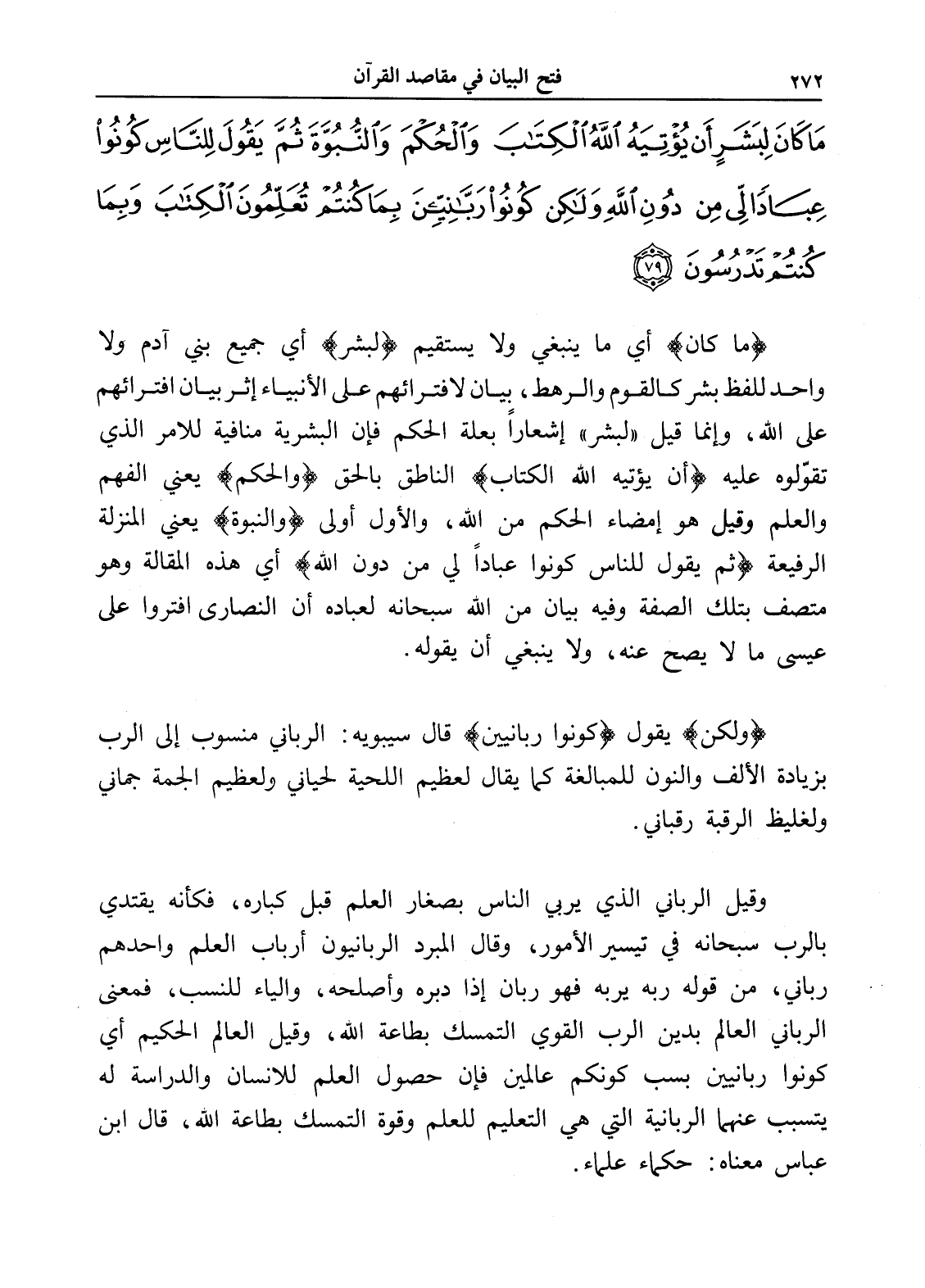 مَا كَانَ لِبَشَرٍ أَنْ يُؤْتِيَهُ اللَّهُ الْكِتَابَ وَالْحُكْمَ وَالنُّبُوَّةَ ثُمَّ يَقُولَ لِلنَّاسِ كُونُوا عِبَادًا لِي مِنْ دُونِ اللَّهِ وَلَكِنْ كُونُوا رَبَّانِيِّينَ بِمَا كُنْتُمْ تُعَلِّمُونَ الْكِتَابَ وَبِمَا كُنْتُمْ تَدْرُسُونَ (79)