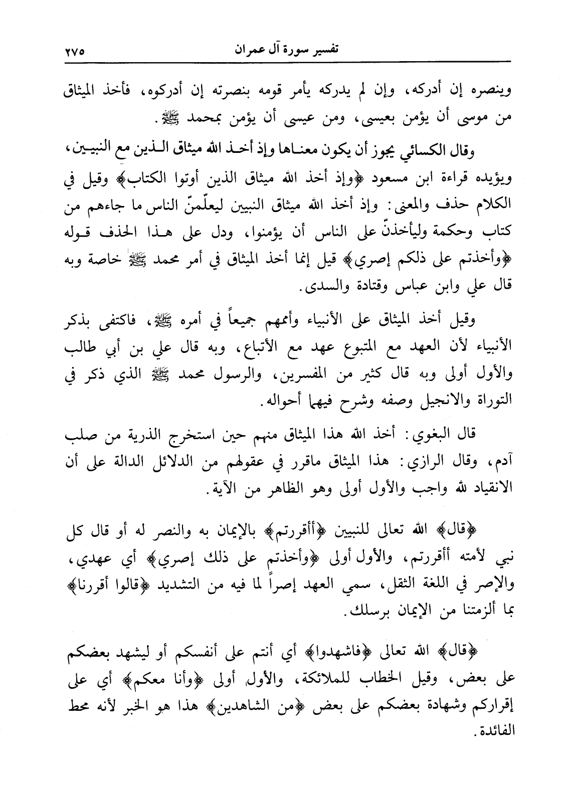 وقال الكسائي يجوز أن يكون معناها وإذ أخذ الله ميثاق الذين مع النبيين، ويؤيده قراءة ابن مسعود (وإذ أخذ الله ميثاق الذين أوتوا الكتاب) وقيل في الكلام حذف والمعنى: وإذ أخذ الله ميثاق النبيين ليعلّمنّ الناس ما جاءهم من كتاب وحكمة وليأخذنّ على الناس أن يؤمنوا، ودل على هذا الحذف قوله (وأخذتم على ذلكم إصري) قيل إنما أخذ الميثاق في أمر محمد - صلى الله عليه وسلم - خاصة وبه قال علي وابن عباس وقتادة والسدى.