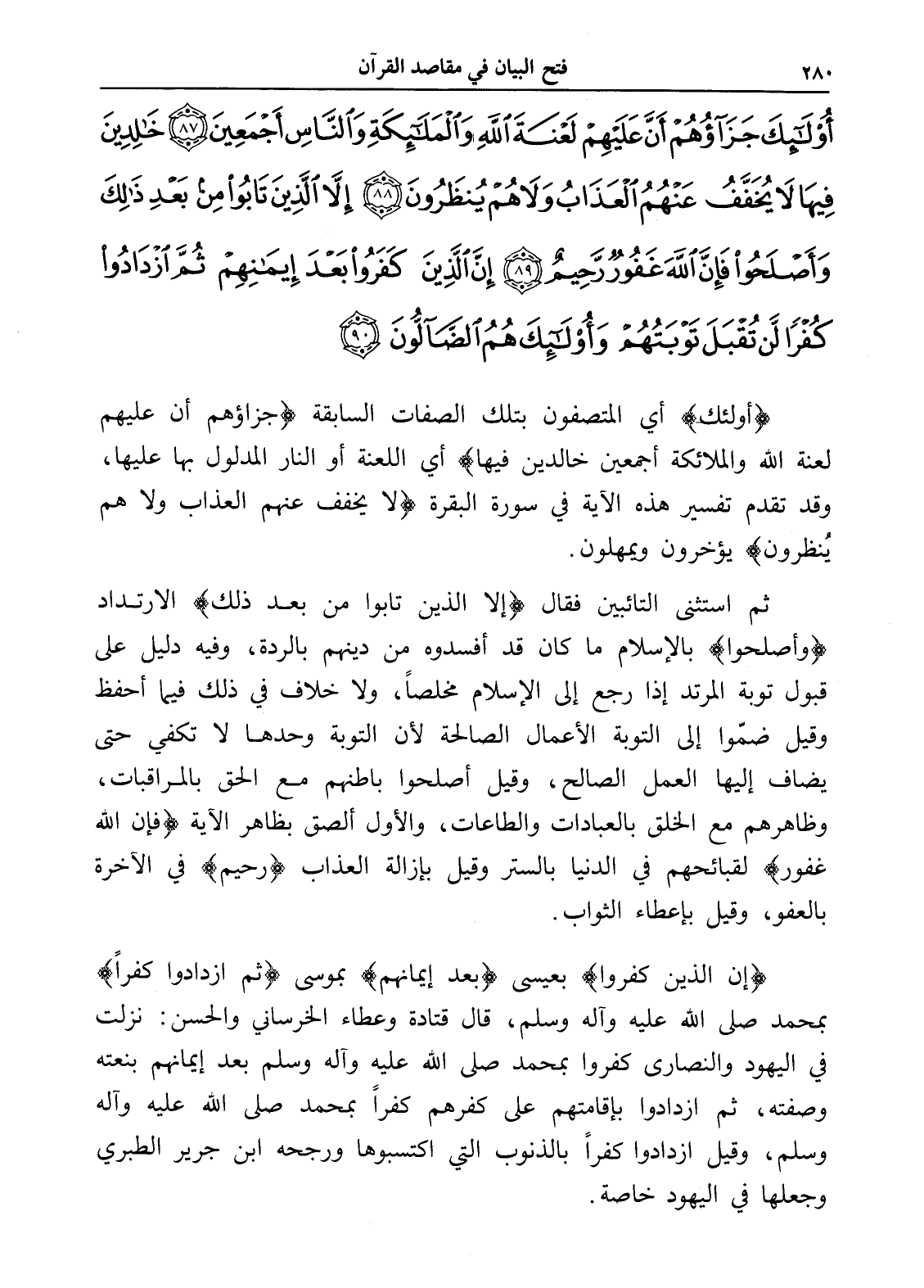 أُولَئِكَ جَزَاؤُهُمْ أَنَّ عَلَيْهِمْ لَعْنَةَ اللَّهِ وَالْمَلَائِكَةِ وَالنَّاسِ أَجْمَعِينَ (87) خَالِدِينَ فِيهَا لَا يُخَفَّفُ عَنْهُمُ الْعَذَابُ وَلَا هُمْ يُنْظَرُونَ (88) إِلَّا الَّذِينَ تَابُوا مِنْ بَعْدِ ذَلِكَ وَأَصْلَحُوا فَإِنَّ اللَّهَ غَفُورٌ رَحِيمٌ (89) إِنَّ الَّذِينَ كَفَرُوا بَعْدَ إِيمَانِهِمْ ثُمَّ ازْدَادُوا كُفْرًا لَنْ تُقْبَلَ تَوْبَتُهُمْ وَأُولَئِكَ هُمُ الضَّالُّونَ (90)