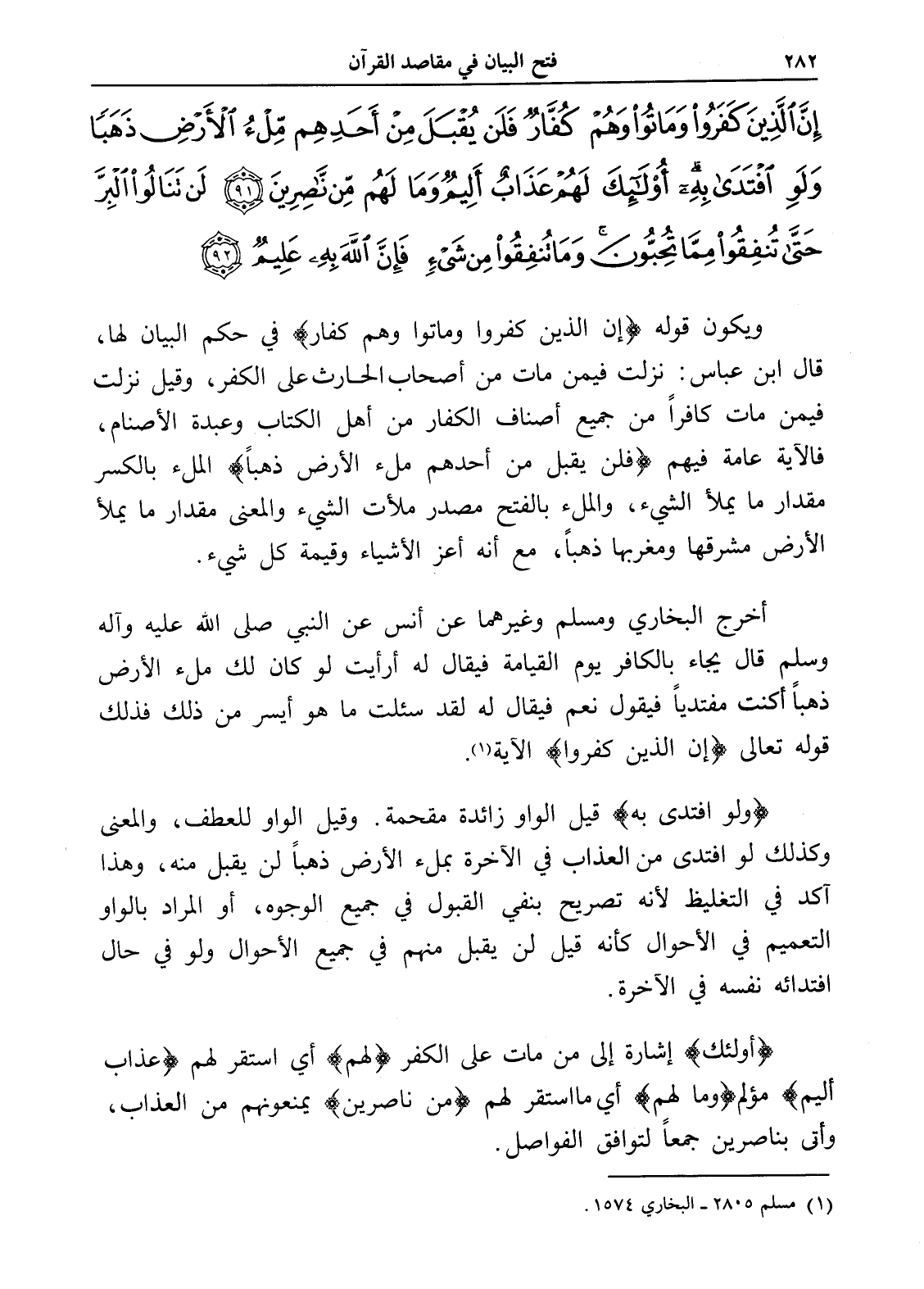 إِنَّ الَّذِينَ كَفَرُوا وَمَاتُوا وَهُمْ كُفَّارٌ فَلَنْ يُقْبَلَ مِنْ أَحَدِهِمْ مِلْءُ الْأَرْضِ ذَهَبًا وَلَوِ افْتَدَى بِهِ أُولَئِكَ لَهُمْ عَذَابٌ أَلِيمٌ وَمَا لَهُمْ مِنْ نَاصِرِينَ (91) لَنْ تَنَالُوا الْبِرَّ حَتَّى تُنْفِقُوا مِمَّا تُحِبُّونَ وَمَا تُنْفِقُوا مِنْ شَيْءٍ فَإِنَّ اللَّهَ بِهِ عَلِيمٌ (92)