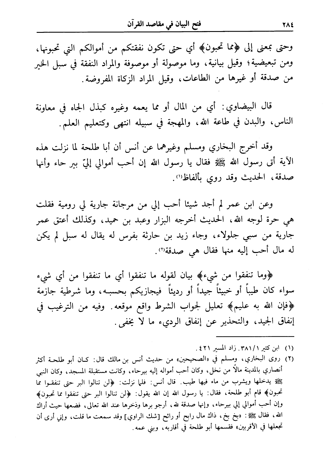 وقد أخرج البخاري ومسلم وغيرهما عن أنس أن أبا طلحة لما نزلت هذه الآية أتى رسول الله - صلى الله عليه وسلم - فقال يا رسول الله إن أحب أموالي إليّ بير حاء وأنها صدقة، الحديث وقد روي بألفاظ (¬1).