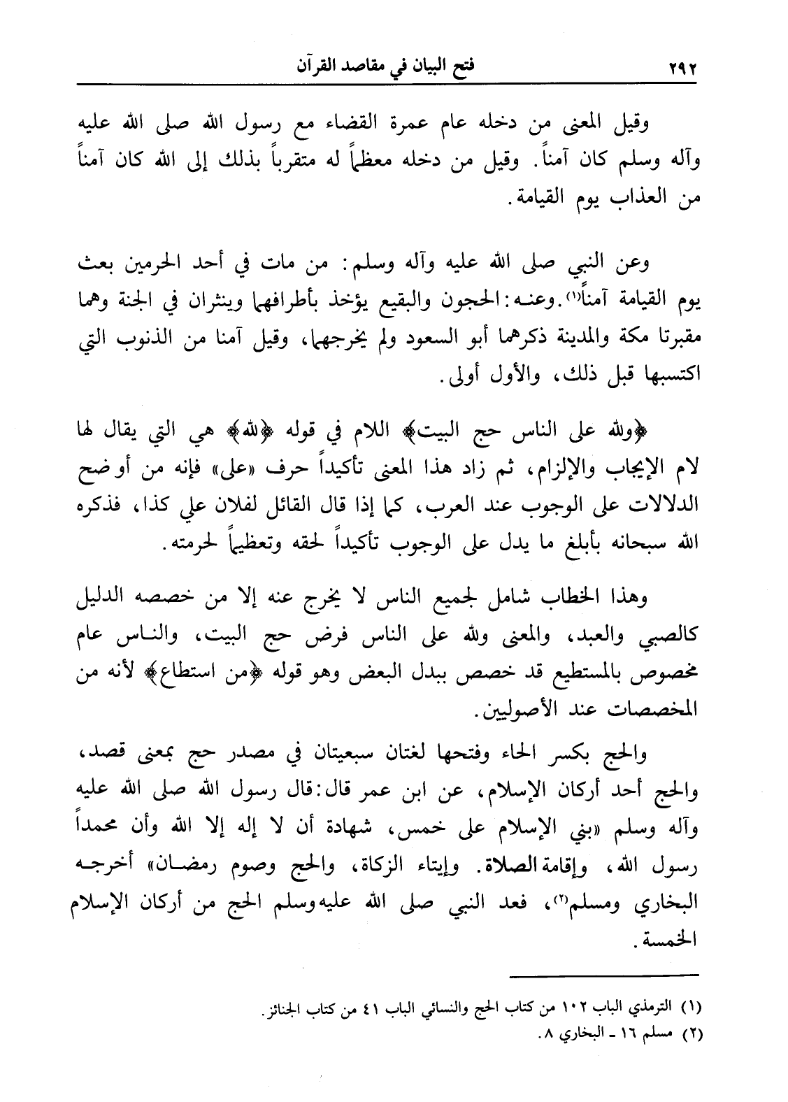 والحج بكسر الحاء وفتحها لغتان سبعيتان في مصدر حج بمعنى قصد، والحج أحد أركان الإسلام، عن ابن عمر قال: قال رسول الله صلى الله عليه وآله وسلم " بني الإسلام على خمس، شهادة أن لا إله إلا الله وأن محمداً رسول الله، وإقامة الصلاة. وإيتاء الزكاة، والحج وصوم رمضان " أخرجه البخاري ومسلم (¬2)، فعد النبي صلى الله عليه وسلم الحج من أركان الإسلام الخمسة.