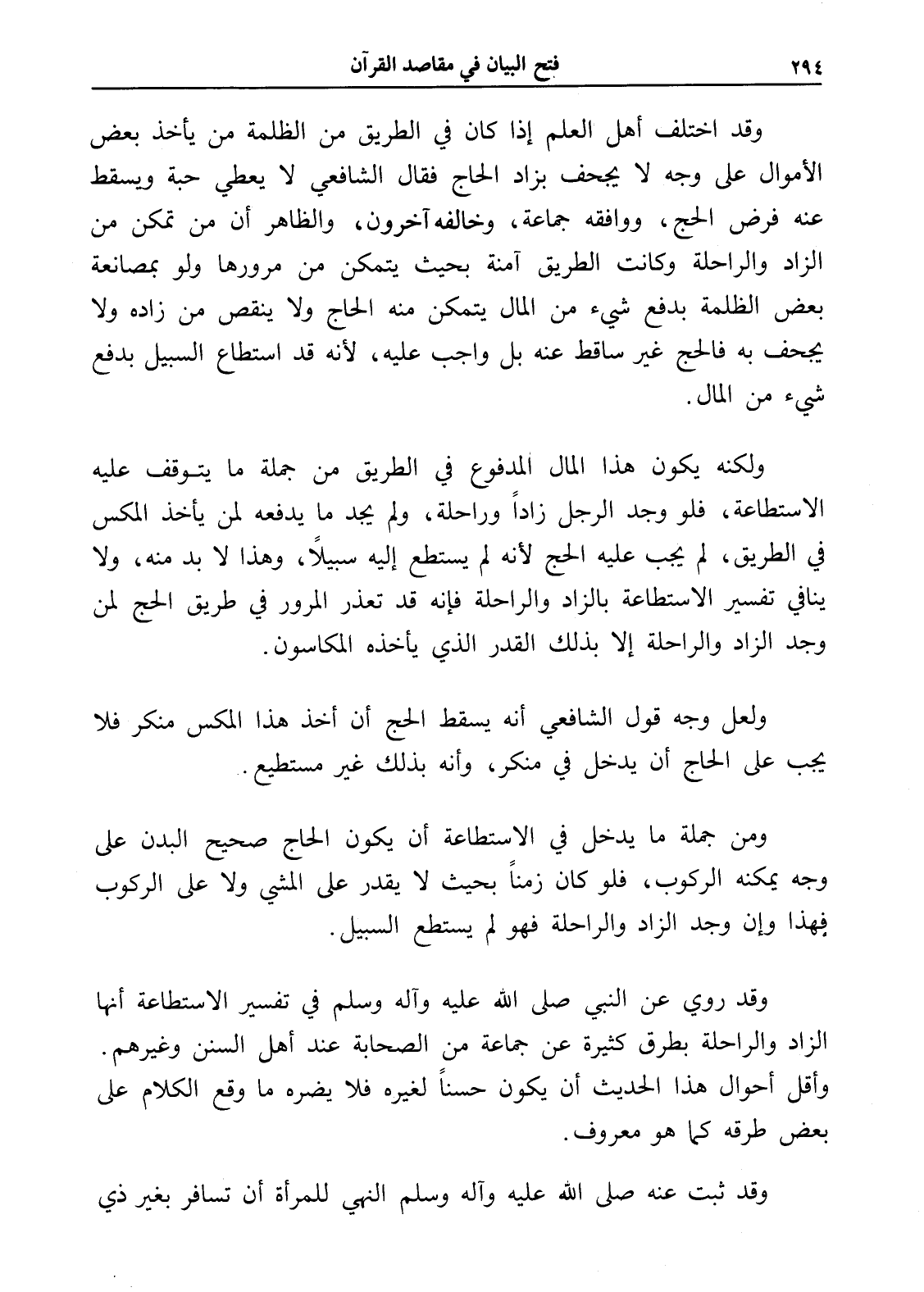 وقد اختلف أهل العلم إذا كان في الطريق من الظلمة من يأخذ بعض الأموال على وجه لا يجحف بزاد الحاج فقال الشافعي لا يعطي حبة ويسقط عنه فرض الحج، ووافقه جماعة، وخالفه آخرون، والظاهر أن من تمكن من الزاد والراحلة وكانت الطريق آمنة بحيث يتمكن من مرورها ولو بمصانعة بعض الظلمة بدفع شيء من المال يتمكن منه الحاج ولا ينقص من زاده ولا يجحف به فالحج غير ساقط عنه بل واجب عليه، لأنه قد استطاع السبيل بدفع شيء من المال.