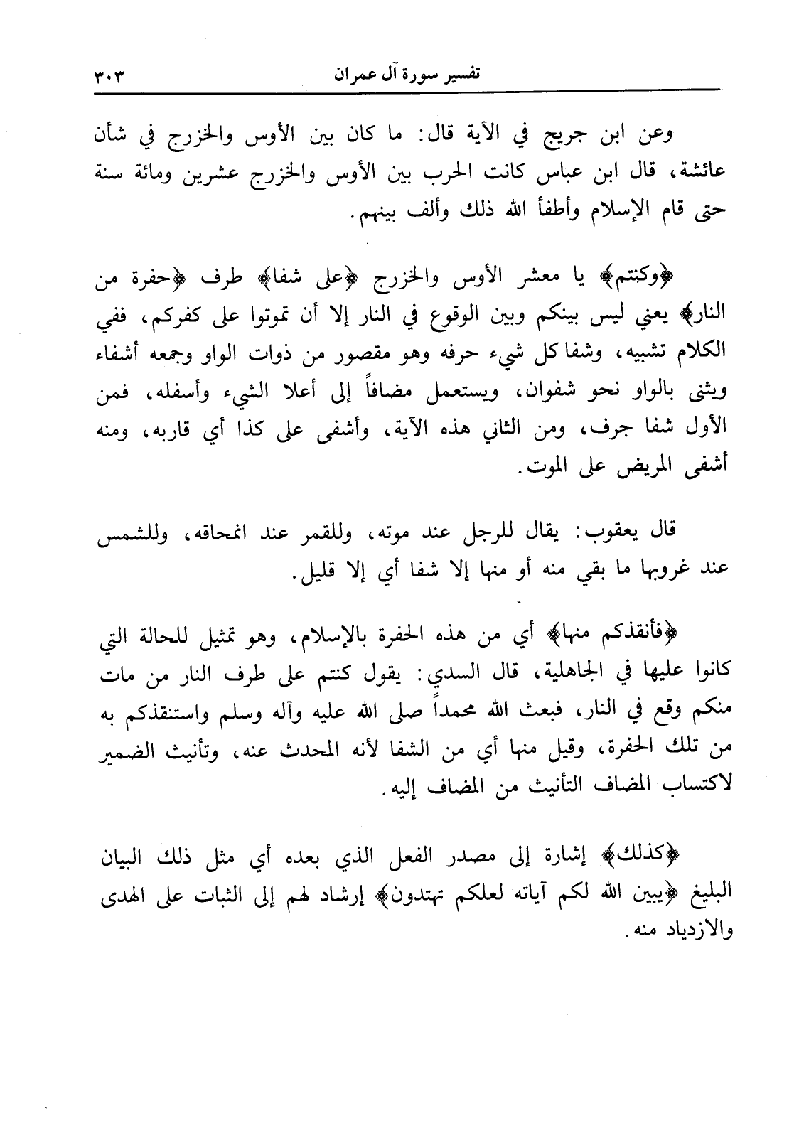 وعن ابن جريج في الآية قال: ما كان بين الأوس والخزرج في شأن عائشة، قال ابن عباس كانت الحرب بين الأوس والخزرج عشرين ومائة سنة حتى قام الإسلام وأطفأ الله ذلك وألف بينهم.