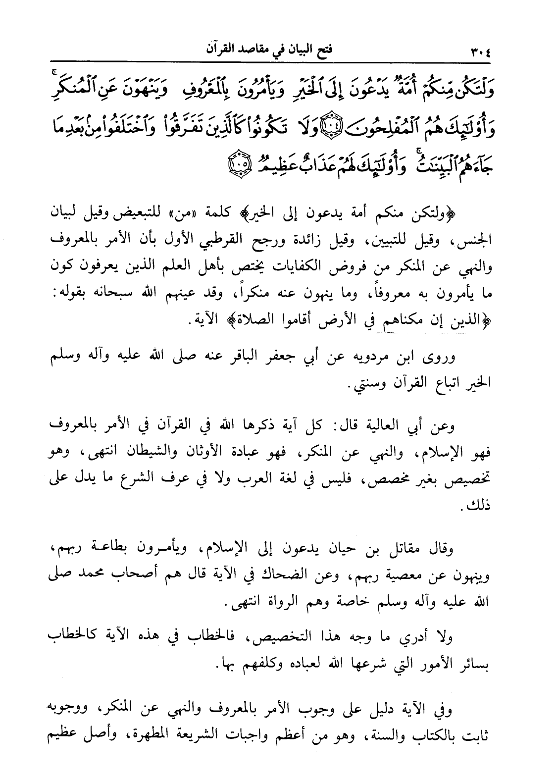 وَلْتَكُنْ مِنْكُمْ أُمَّةٌ يَدْعُونَ إِلَى الْخَيْرِ وَيَأْمُرُونَ بِالْمَعْرُوفِ وَيَنْهَوْنَ عَنِ الْمُنْكَرِ وَأُولَئِكَ هُمُ الْمُفْلِحُونَ (104) وَلَا تَكُونُوا كَالَّذِينَ تَفَرَّقُوا وَاخْتَلَفُوا مِنْ بَعْدِ مَا جَاءَهُمُ الْبَيِّنَاتُ وَأُولَئِكَ لَهُمْ عَذَابٌ عَظِيمٌ (105)