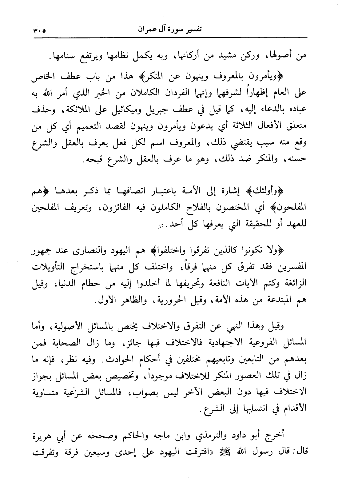 وقيل وهذا النهي عن التفرق والاختلاف يختص بالمسائل الأصولية، وأما المسائل الفروعية الاجتهادية فالاختلاف فيها جائز، وما زال الصحابة فمن بعدهم من التابعين وتابعيهم مختلفين في أحكام الحوادث. وفيه نظر، فإنه ما زال في تلك العصور المنكر للاختلاف موجوداً، وتخصيص بعض المسائل بجواز الاختلاف فيها دون البعض الآخر ليس بصواب، فالمسائل الشرعيه متساوية الأقدام في انتسابها إلى الشرع.