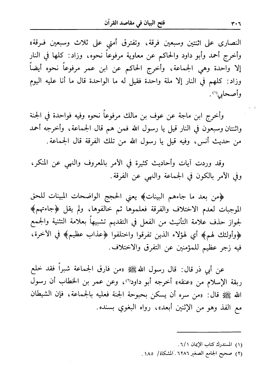 النصارى على اثنتين وسبعين فرقة، وتفترق أمتي على ثلاث وسبعين فرقة " وأخرج أحمد وأبو داود والحاكم عن معاوية مرفوعاً نحوه، وزاد: كلها في النار إلا واحدة وهي الجماعة، وأخرج الحاكم عن ابن عمر مرفوعاً نحوه أيضاً وزاد: كلهم في النار إلا ملة واحدة فقيل له ما الواحدة قال ما أنا عليه اليوم وأصحابي (¬1).